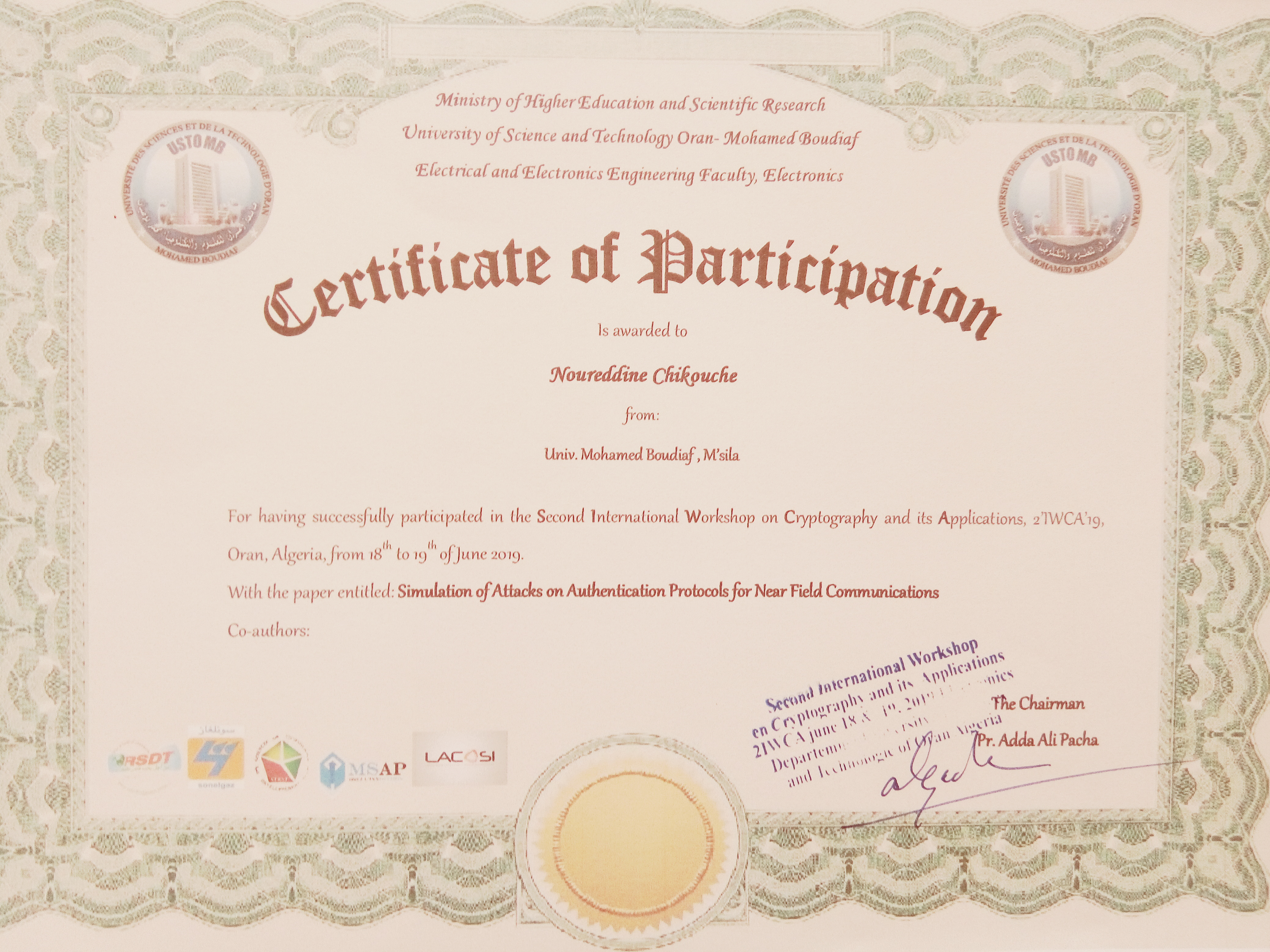 M. CHIKOUCHE Noureddine, (2019), "Simulation of Attacks on Authentication Protocols for Near Field Communications", [national] 2nd International Workshop on Cryptography and its Applications (2’IWCA’19) , Oran
