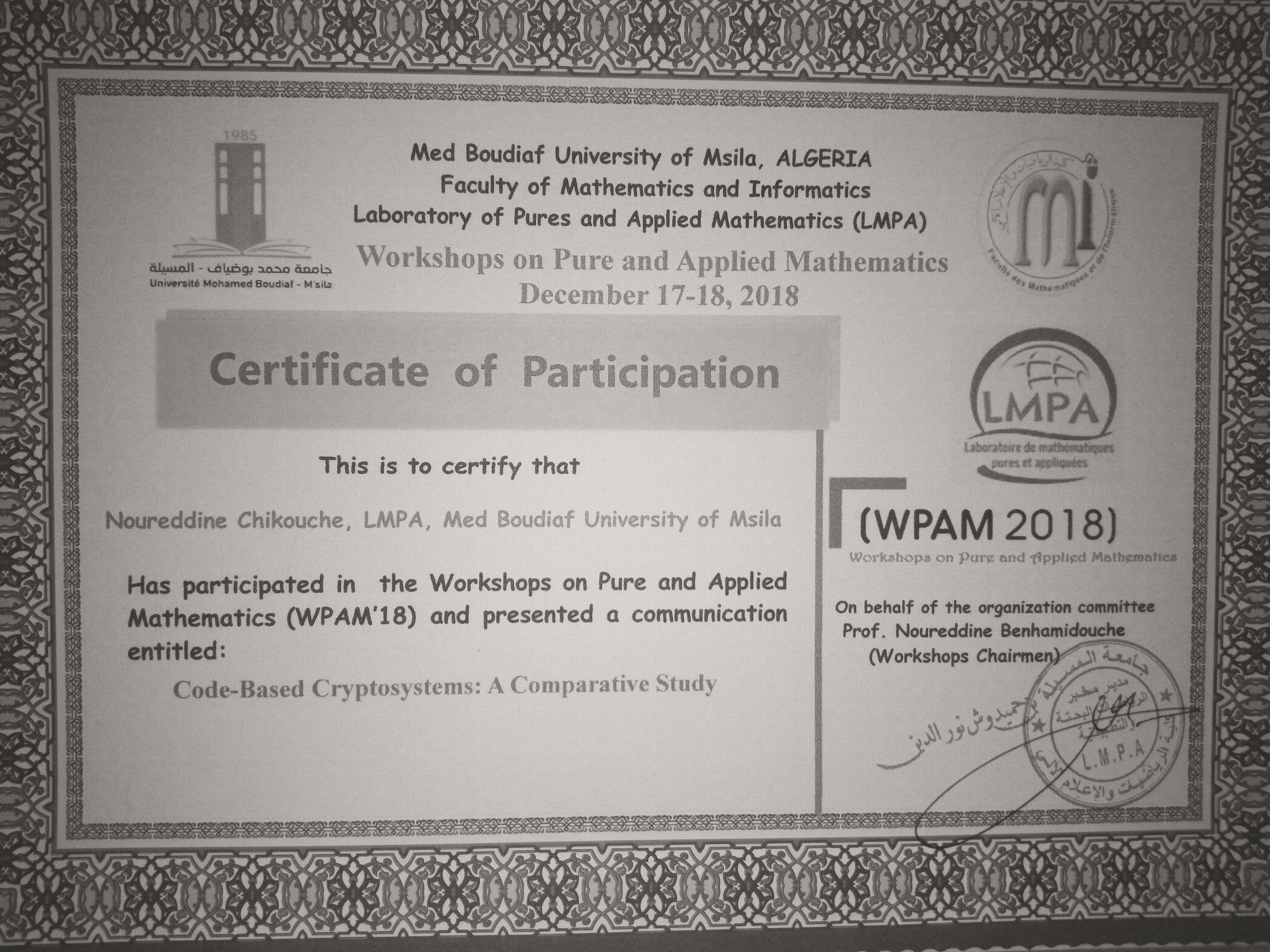 M. CHIKOUCHE Noureddine, (2018), "Code-Based Cryptosystems: A Comparative Study", [national] Workshops on Pure and Applied Mathematics (WPAM'2018) , M´sila