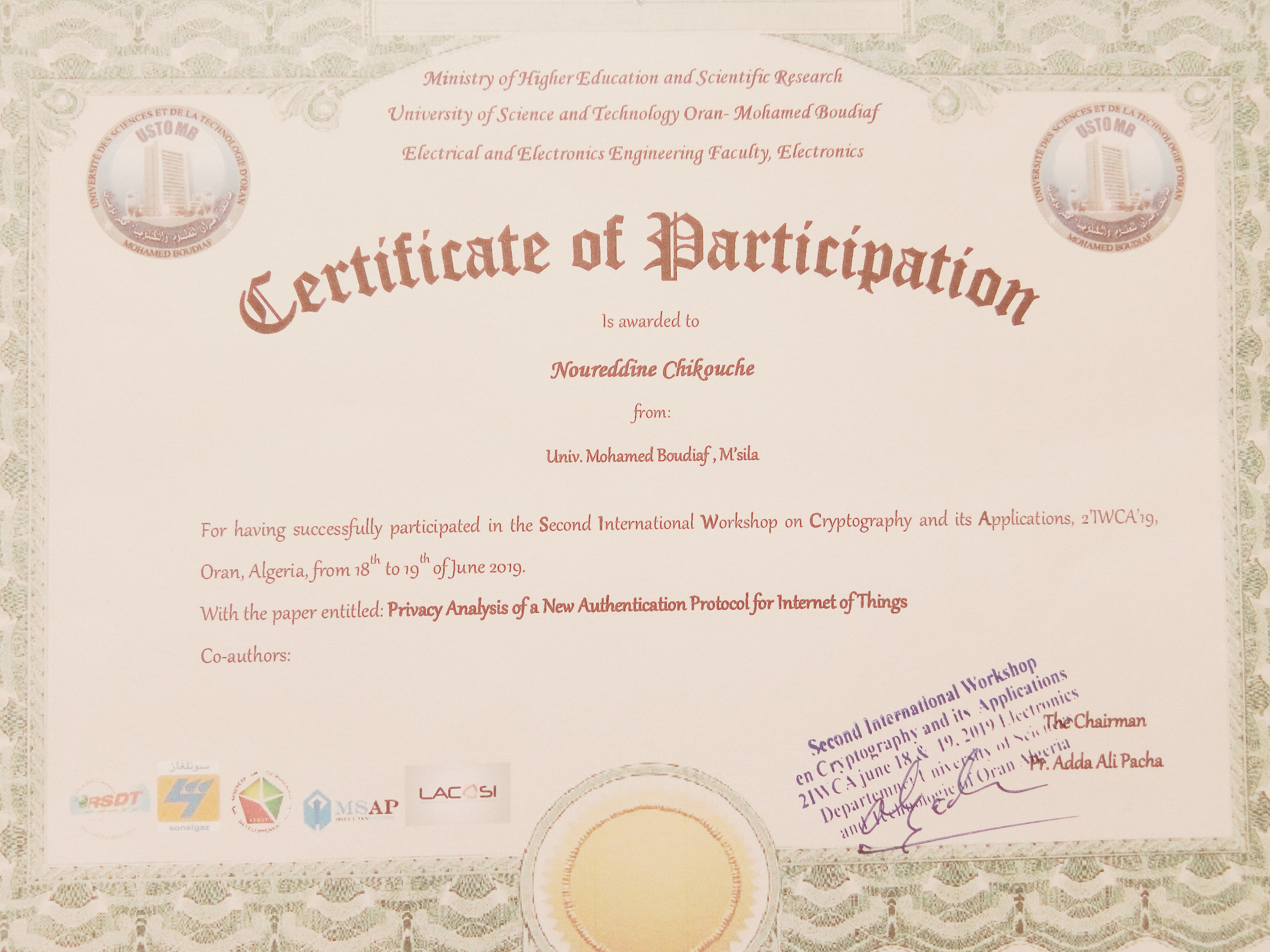 M. CHIKOUCHE Noureddine, (2019), "Privacy Analysis of a New Authentication Protocol for Internet of Things", [international] International Workshop on Cryptography and its Applications (2’IWCA’19) , Oran