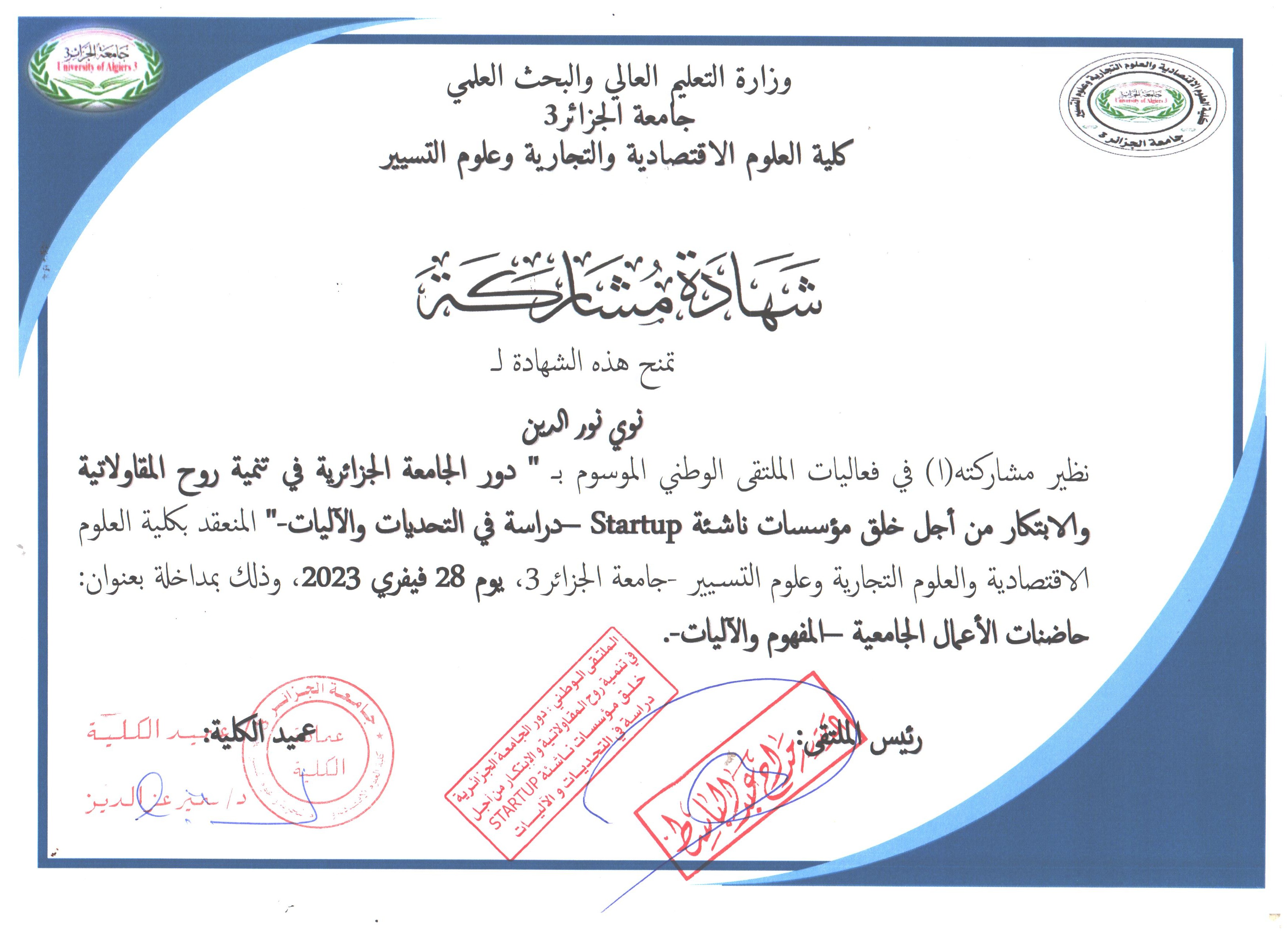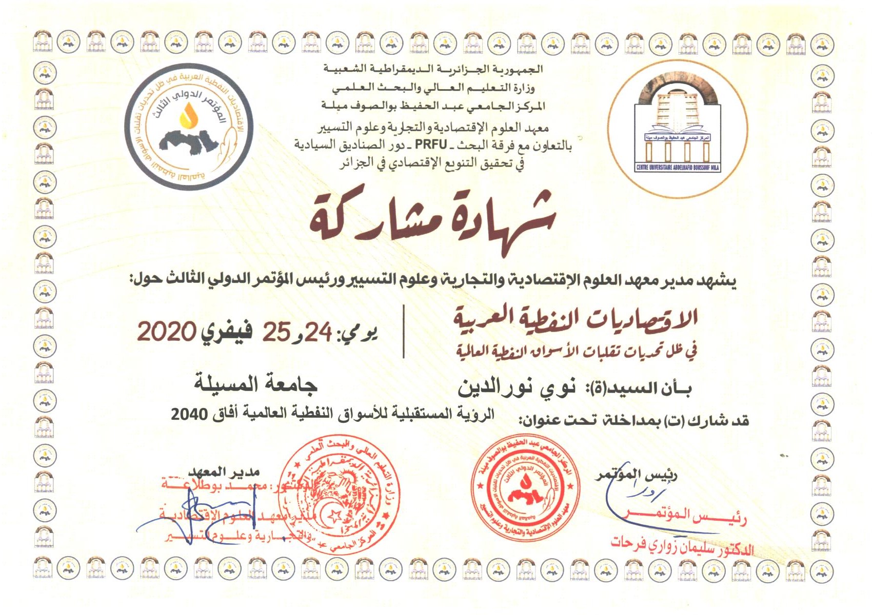 M. NOUI Noureddine, (2023-04-16), "عنوان الورقة البحثية:ظاهرة هجرة الأدمغة في الجزائر - الأسباب وآليات الحد منها-", [international] دور الكفاءات الوطنية في تحقيق الإقلاع الاقتصادي , جامعة برج بوعريريج