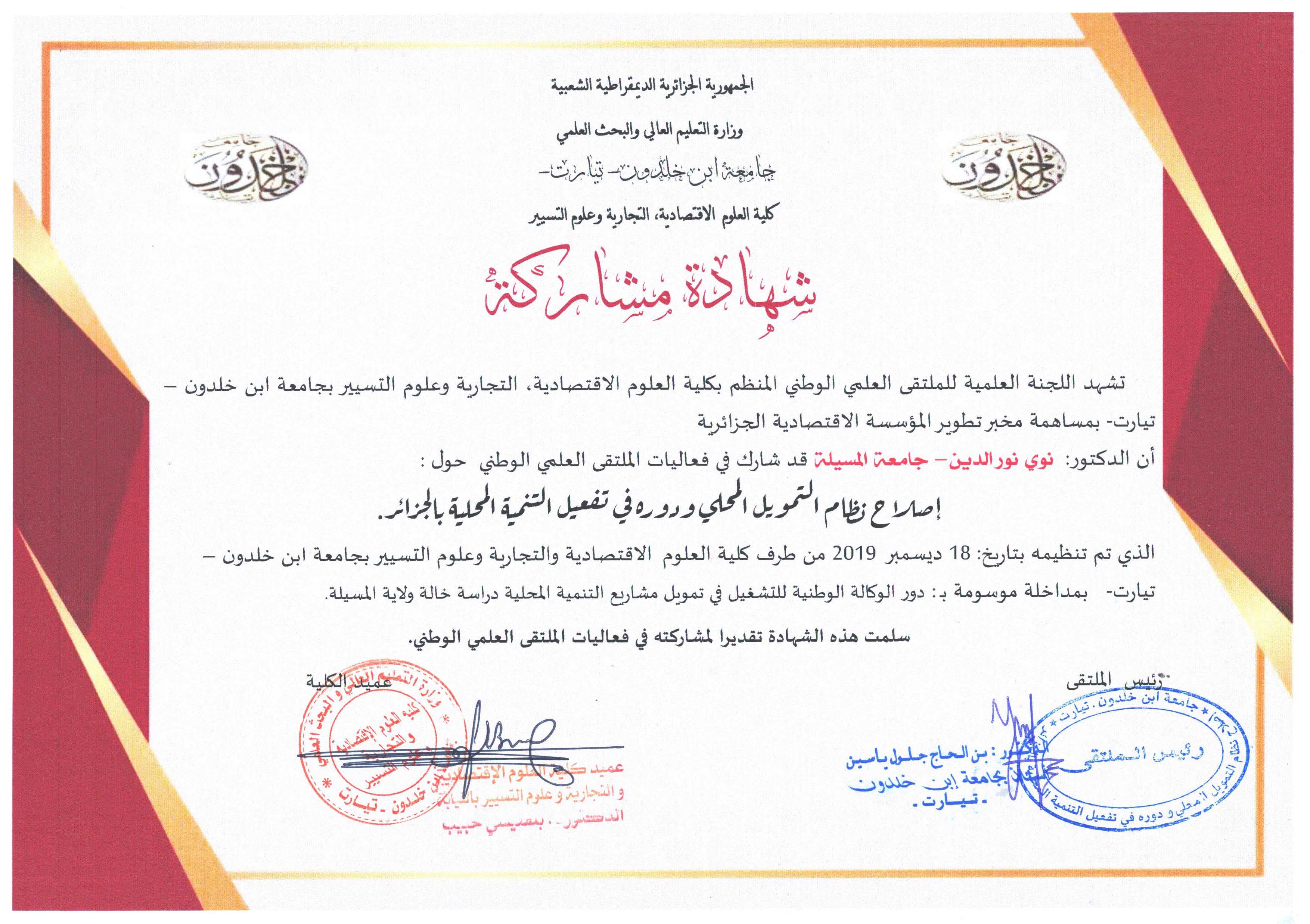 M. NOUI Noureddine, (2019), "فرص الاستثمار في الطاقة الشمسية بالجزائر", [international] الملتقى الدولي الاول مال وأعمال نحو اندماج اعمق لثروتي الماء والطاقة , جامعة الواد
