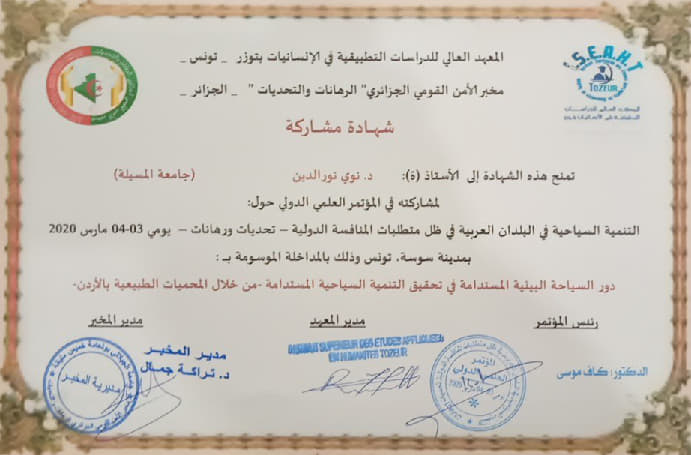 M. NOUI Noureddine, (2020), "دور السياحة البيئية المستدامة في تحقيق التنمية السياحية المستدامة", [international] التنمية السياحية في البلدان العربية في ظل المنافسة الدولية -تحديات ورهانات- , جامعة قفصة-تونس