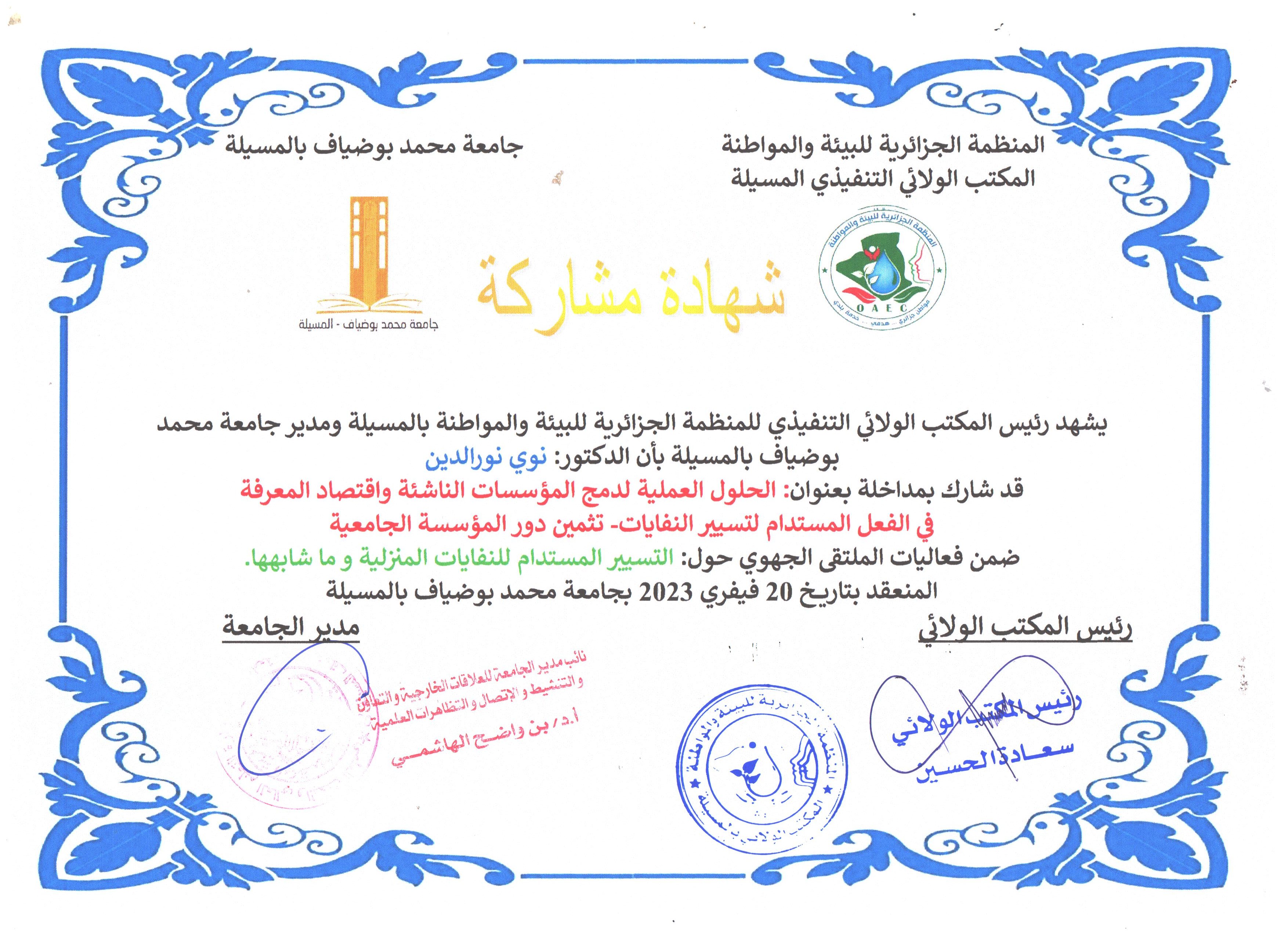 M. NOUI Noureddine, (2023), "الحلول العملية لدمج المؤسسات الناشئة واقتصاد المعرفة في الفعل المستدام لتسيير النفايات", [national] التسيير المستدام للنفايات المنزلية , جامعة المسيلة