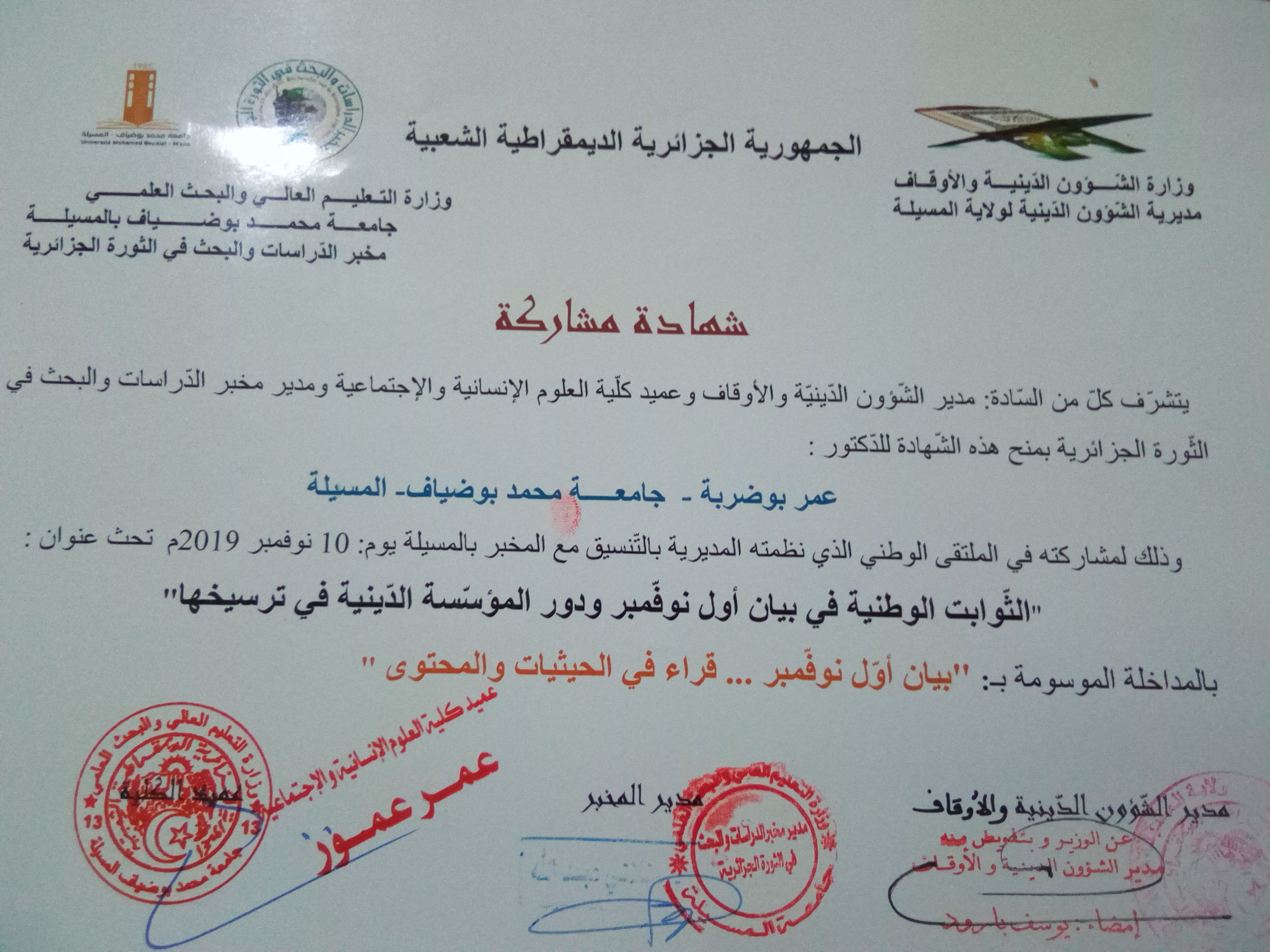 M. BOUDERBA. Omar, (2019), "بيان أول نوفمبر قراءة في الحيثيات والمحتوى", [national] الثوابت الوطنية في بيان أول نوفمبر ودور المؤسسة الدينية في ترسيخها , جامعة محمد بوضياف المسيلة