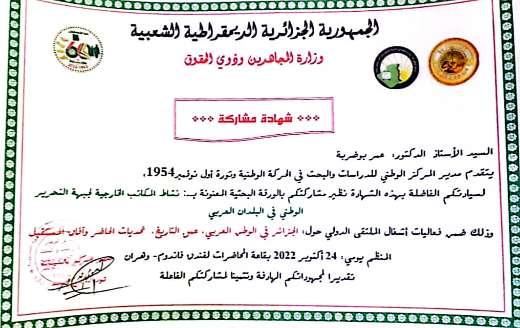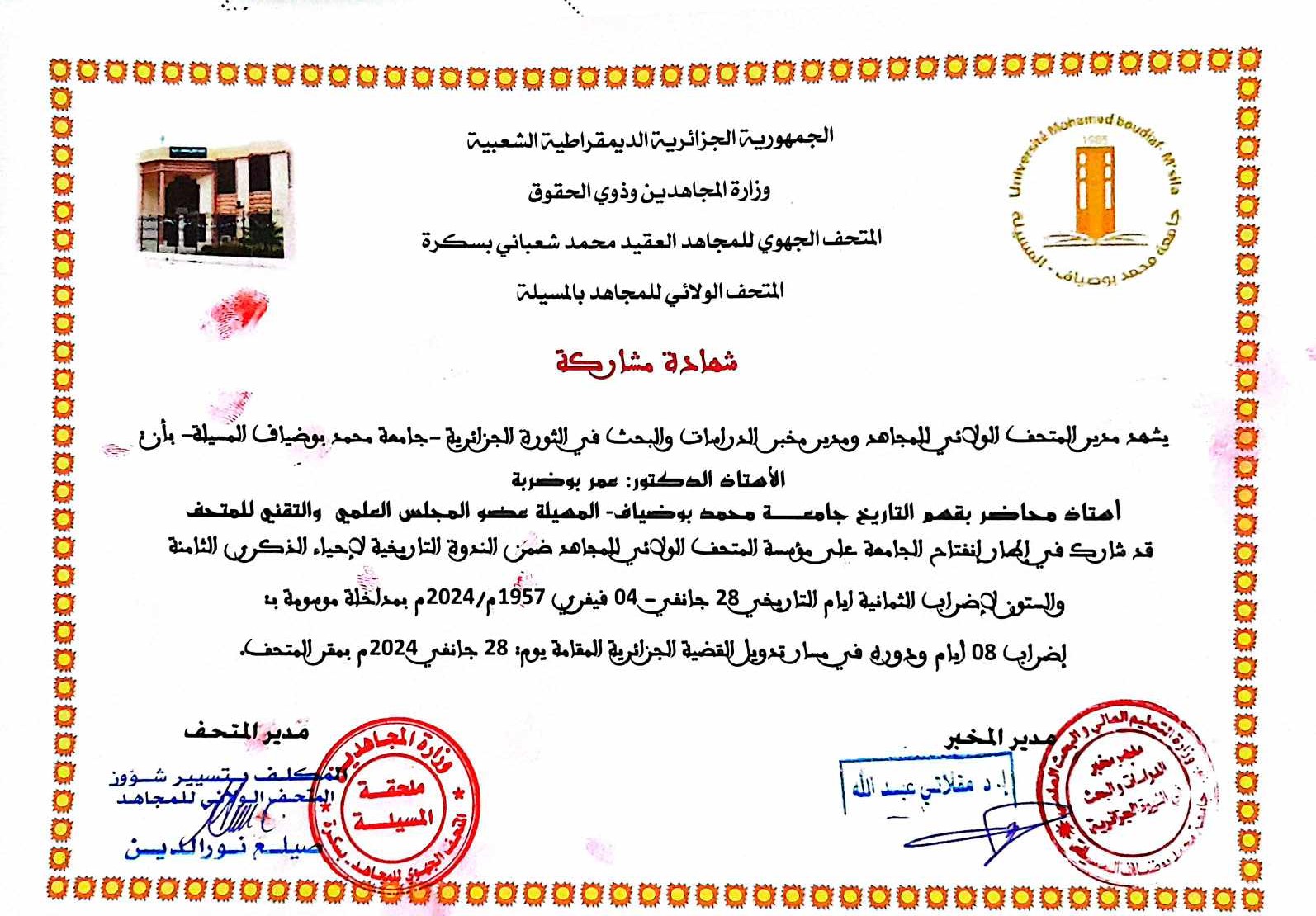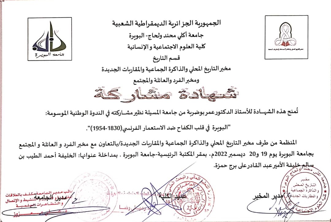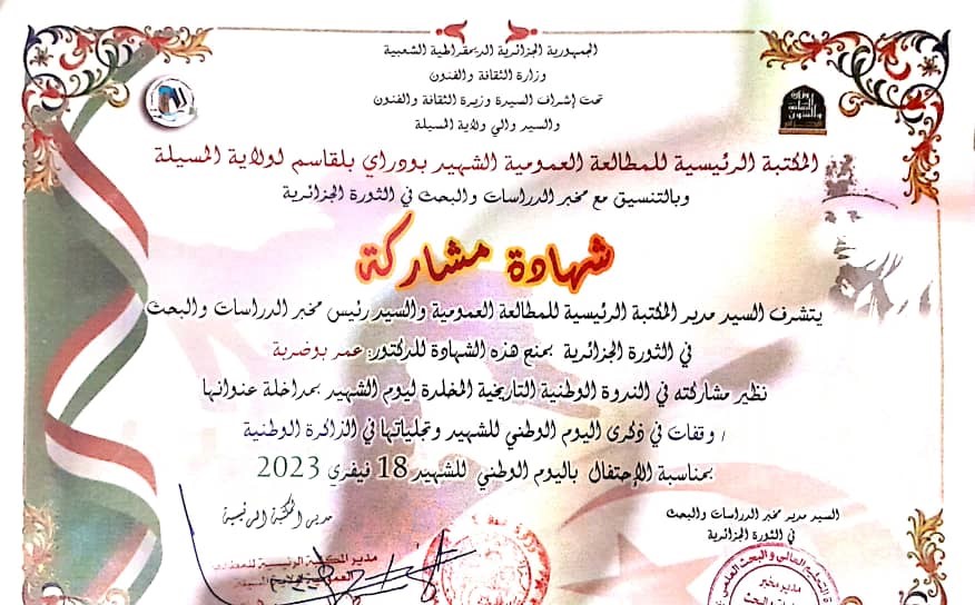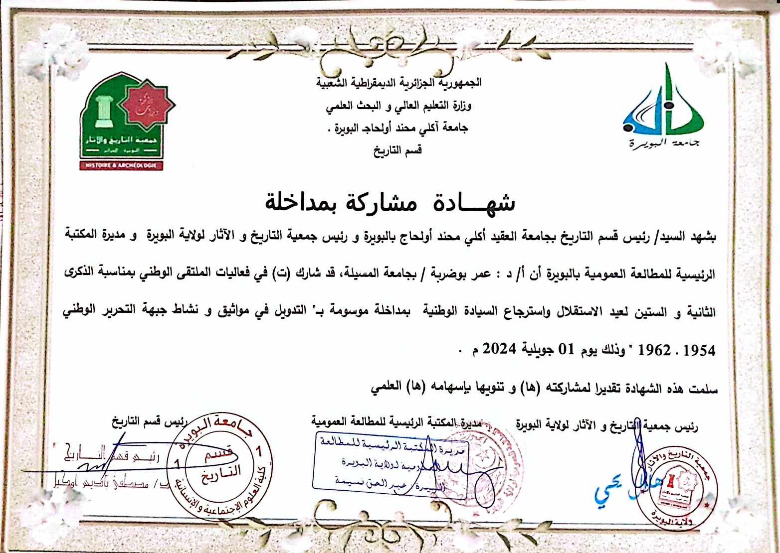M. BOUDERBA. Omar, (2024-01-22), "الثورة الجزائرية في الكتابات العربية والأجنبية", [national] , مخبر الدراسات والبحث في الثورة الجزائرية-جامعة المسيلة