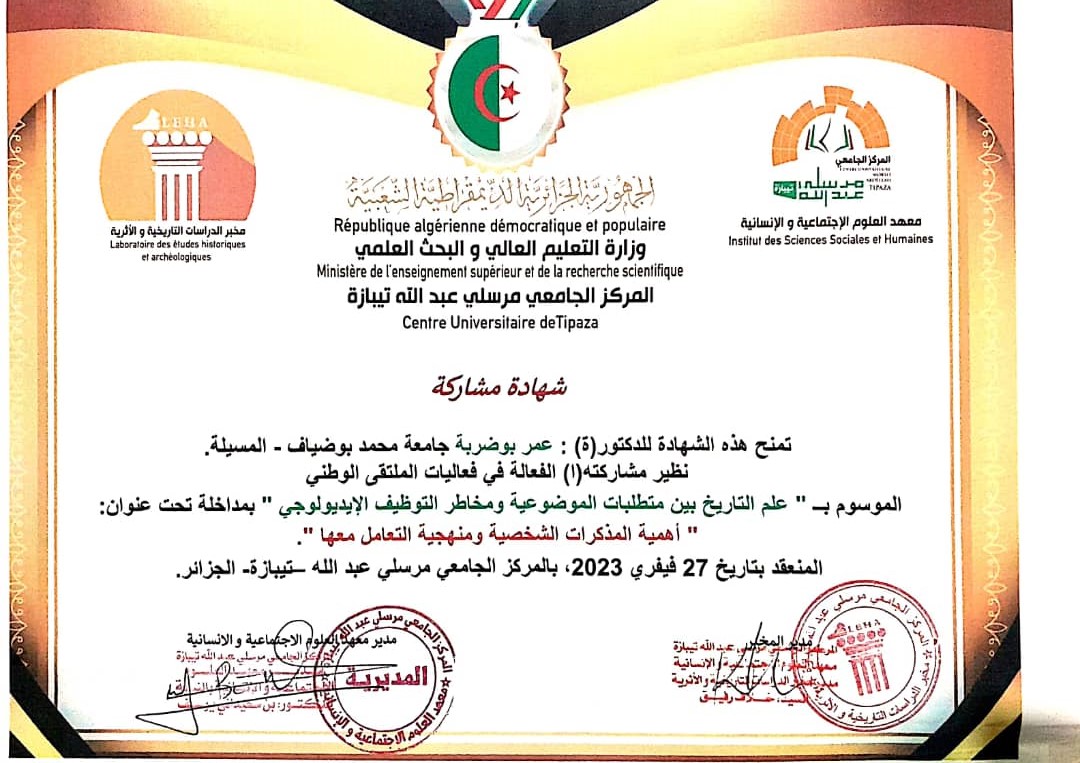 M. BOUDERBA. Omar, (2023), "علم التاريخ بين متطلبات الموضوعية ومخاطر التوظيف الايديولوجي", [national] أهمية المذكرات ومنهجية التعامل معها , المركز الجامعي تيبازة