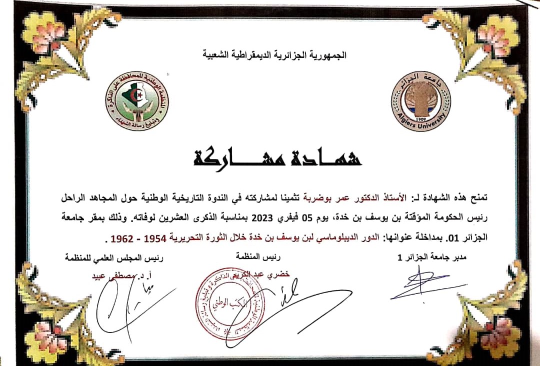 M. BOUDERBA. Omar, (2023), "ندوة تاريخية بمناسبة الذكرى العشرون لوفاة المناضل بن يوسف بن خدة", [national] الدور الدبلوماسي لبن يوسف بن خدة خلال الثورة الجزائرية 1955/ 1962 , جامعة بن يوسف بن خدة الجزائر 2