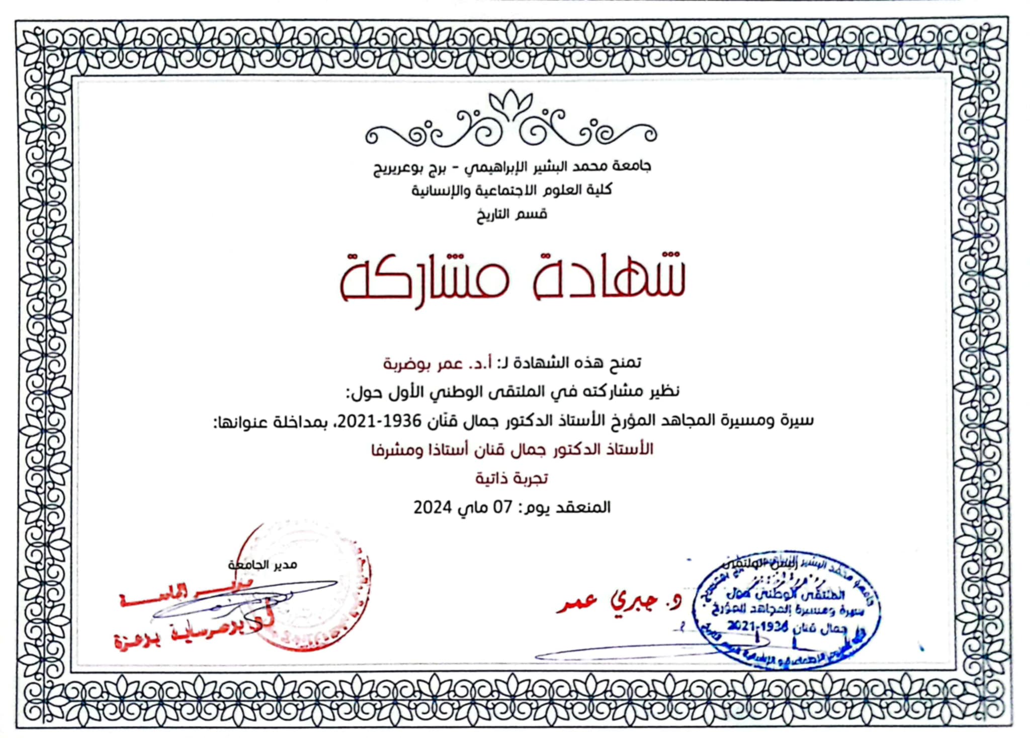 M. BOUDERBA. Omar, (2024-05-07), "الاستاذ الدكتور جمال قنان أستاذا ومشرفا -تجربة ذاتية", [national] سيرة ومسيرة المجاهد المؤرخ الدكتور جمال قنان 1936- 2021 , جامعة محمد البشير الابراهيمي -برج بوعريريج