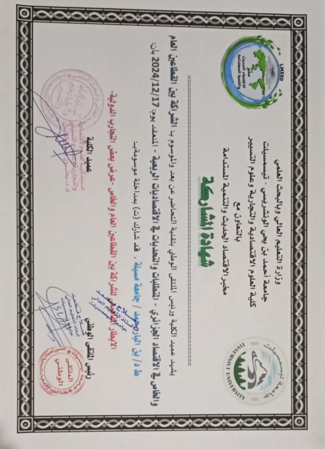 M. BENELBAR M'hamed, (2024-12-17), "الاطار المفاهيمي الشراكة بين القطاعين العام والخاص - عرض بعض التجارب الدولية-", [national] الملتقى الوطني حول الشراكة بين القطاعين العام والخاص في الاقتصاد الجزائري المتطلبات والتحديات في الاقتصاديات الريعية , جامعة تسمسيلت