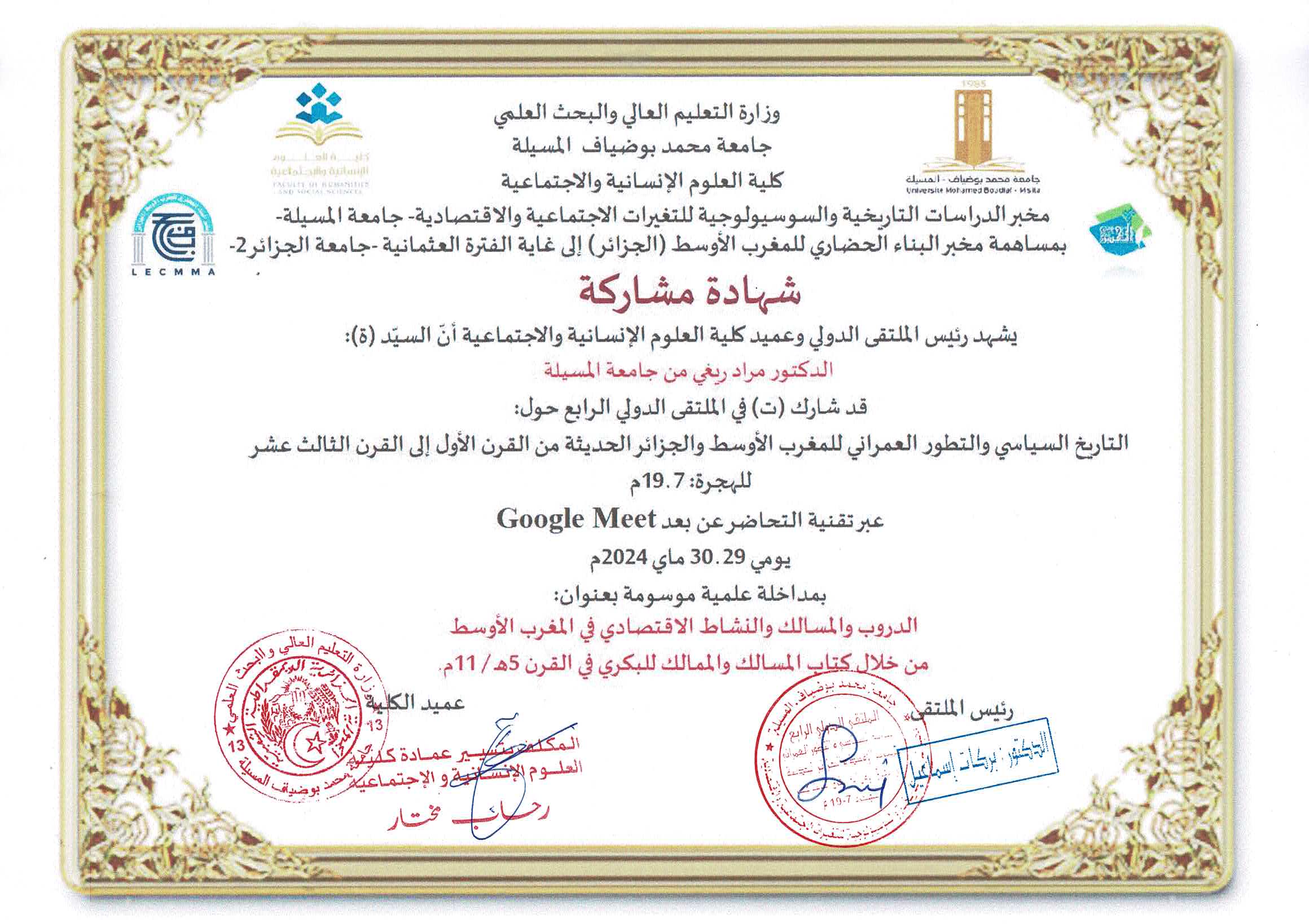 M. RIGHI Mourad, (2024-05-29), "الدروب والمسالك والنشاط الاقتصادي في المغرب الأوسط من خلال كتاب المسالك والممالك للبكري في القرن 11م.", [international] التاريخ السياسي والتطور العمراني للمغرب الأوسط والجزائر الحديثة من القرن الأول إلى القرن الثالث عشرللهجرة 7-19 م , جامعة محمد بوضياف المسيلة