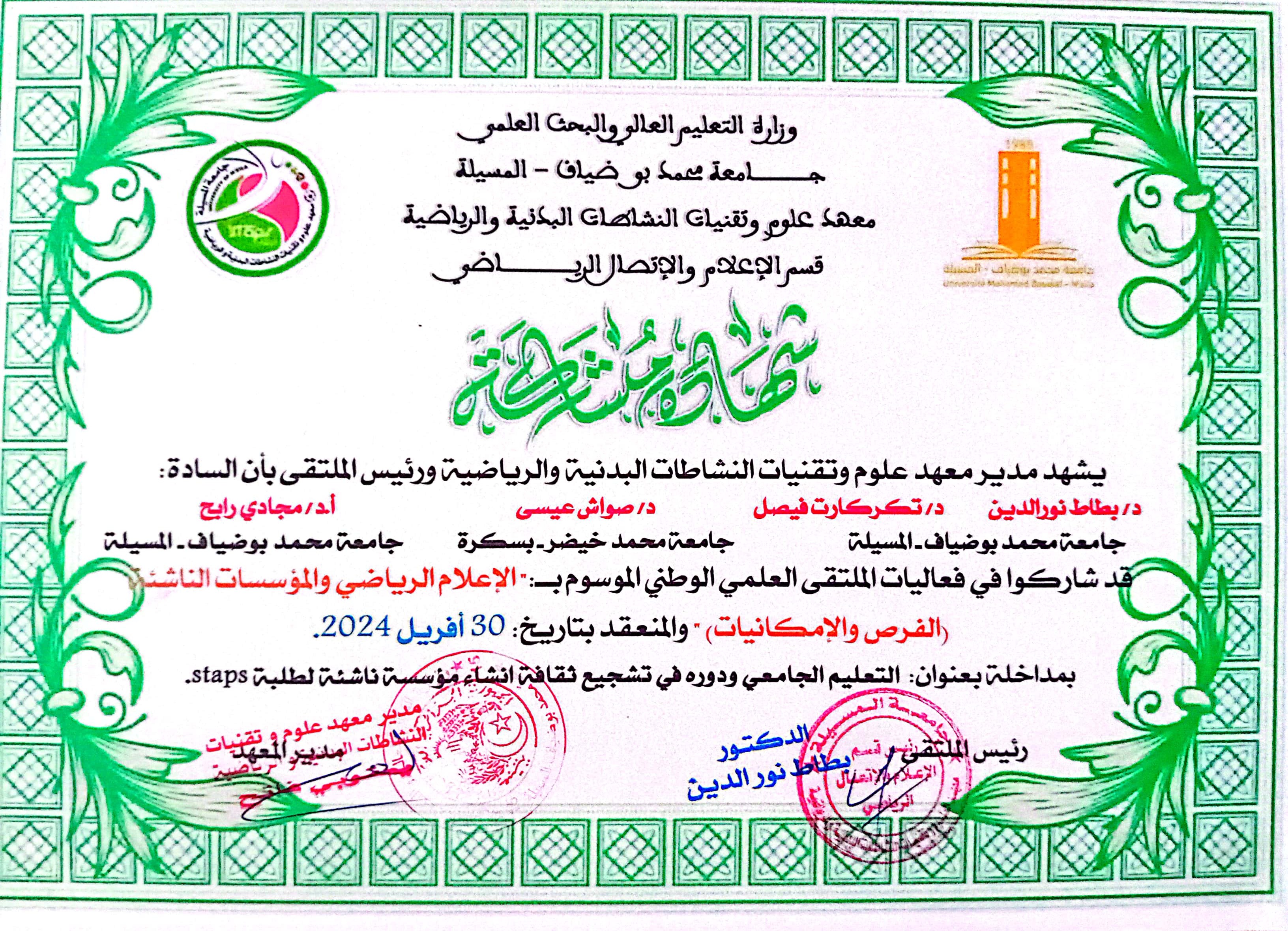 M. MEDJADI Rabeh, (2024-04-23), "اهممييةة البريد والموقع الالكترونيين في نجاح المؤسسسسةالرياضية", [national] رابح مجادي , جامعة المسيلة