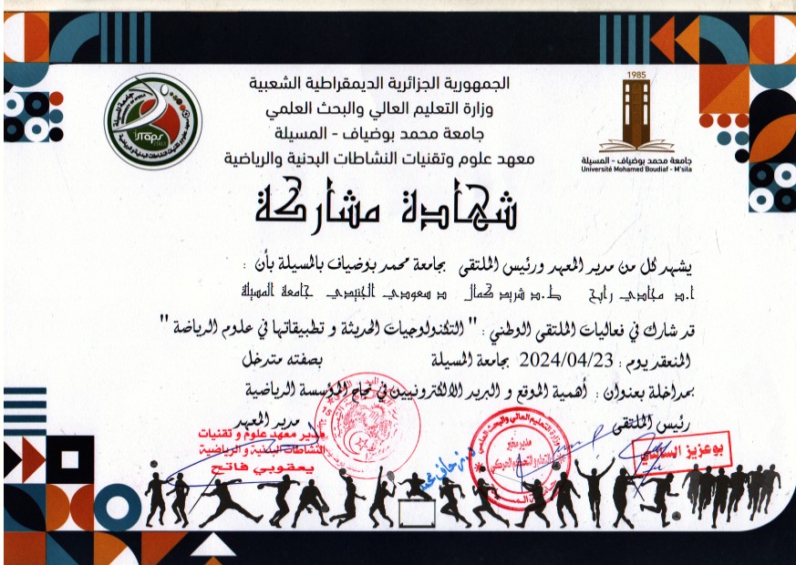 M. MEDJADI Rabeh, (2025-04-16), "اثر برنامج تدريببي مقترح في تطوير مداومة القوة للاطراف العلوية وعلاقتها بدقة التصويب", [international] رابح مجادي , جامعة المسيلة