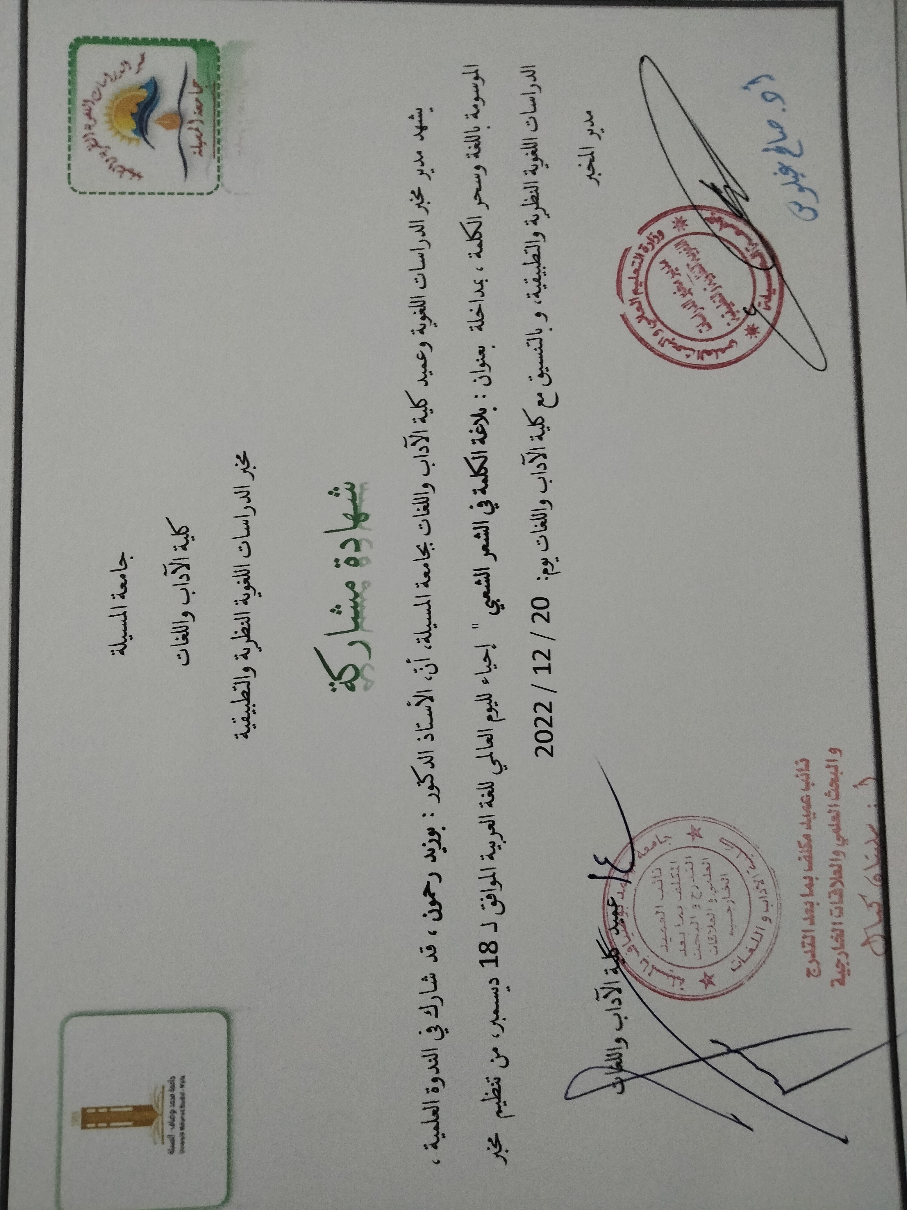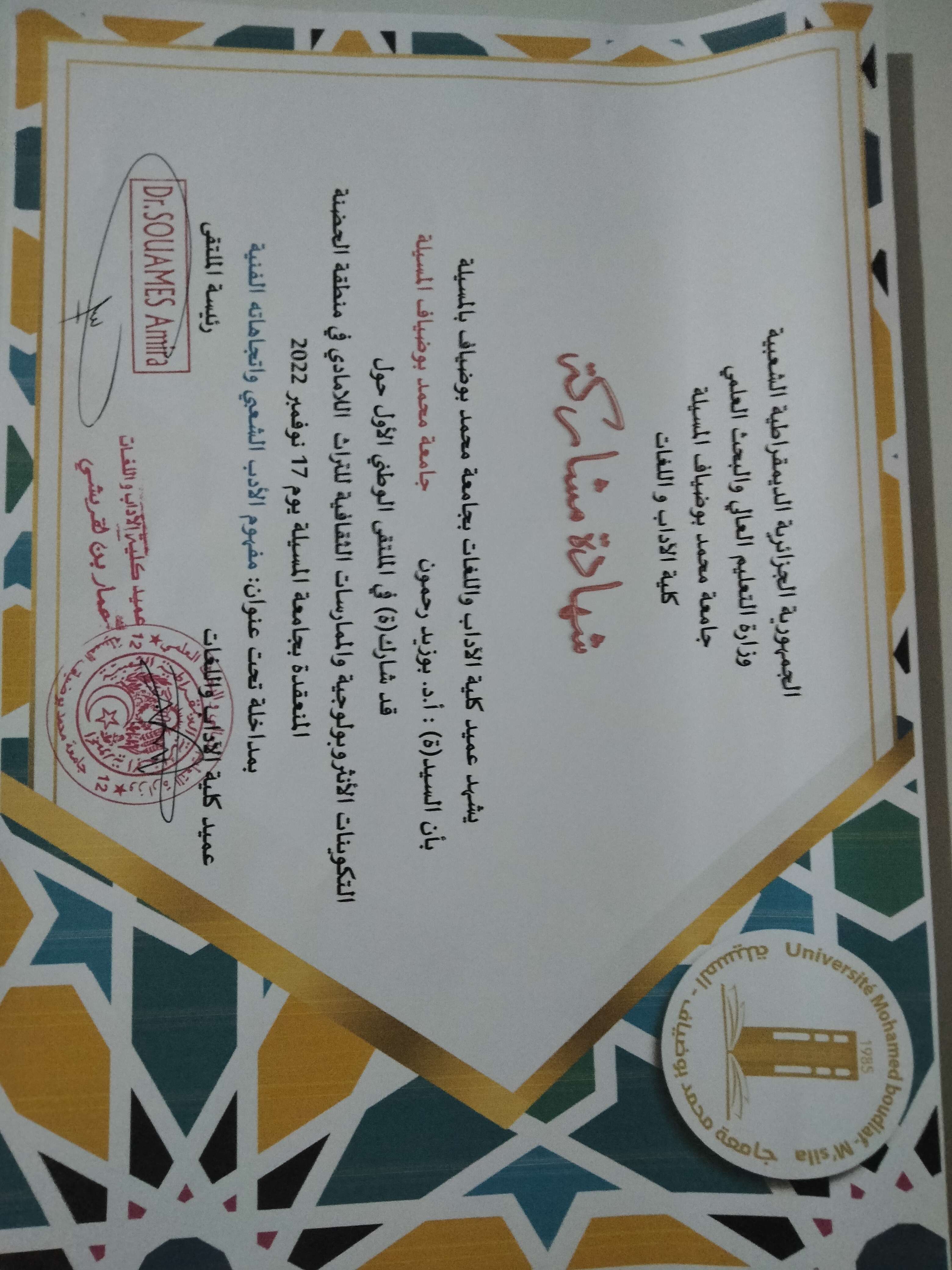 M. RAHMOUNE Bouzid, (2022), "بلاغة الكلمة في الشعر الشعبي", [national] /// , جامعة المسيلة