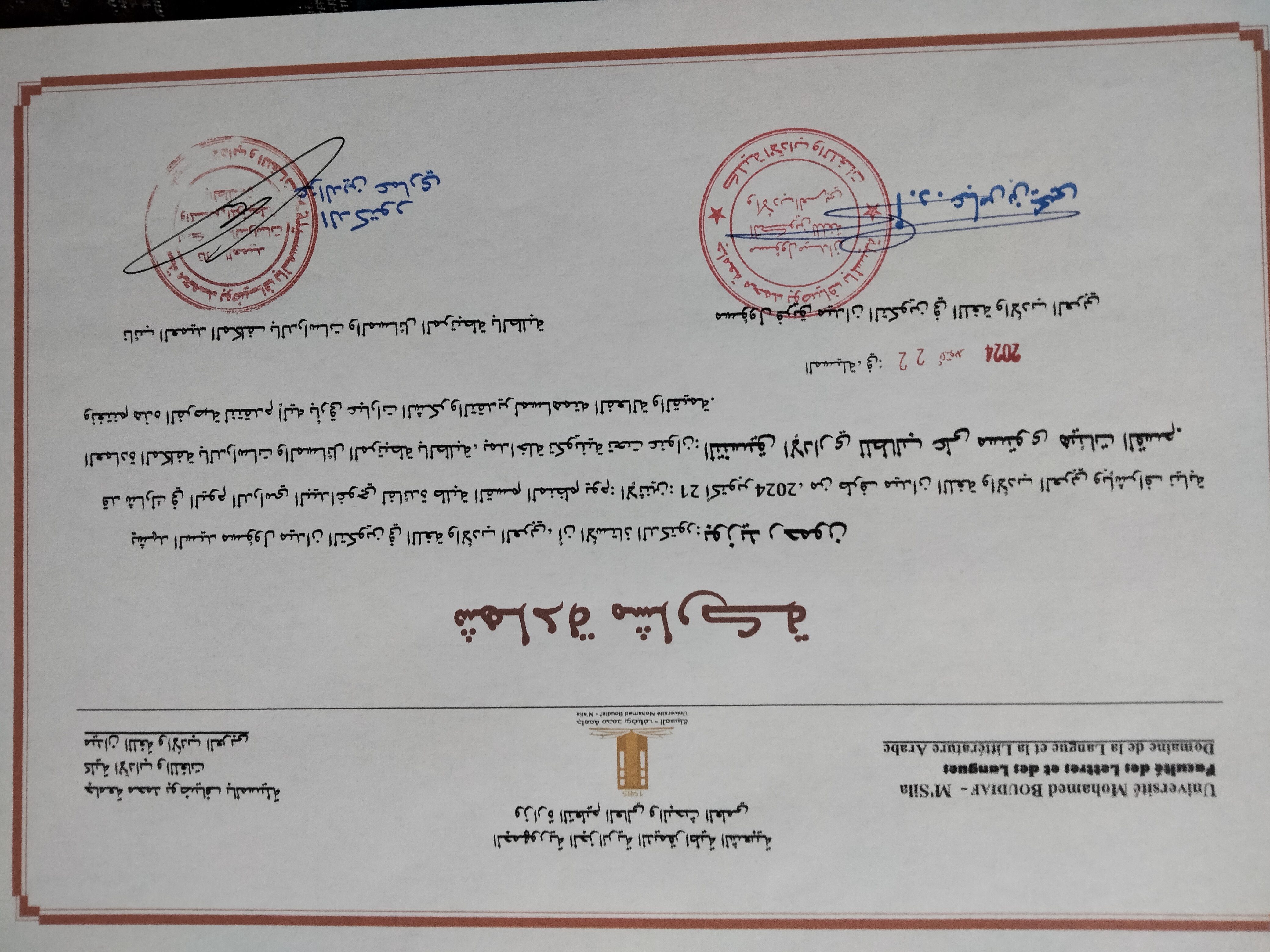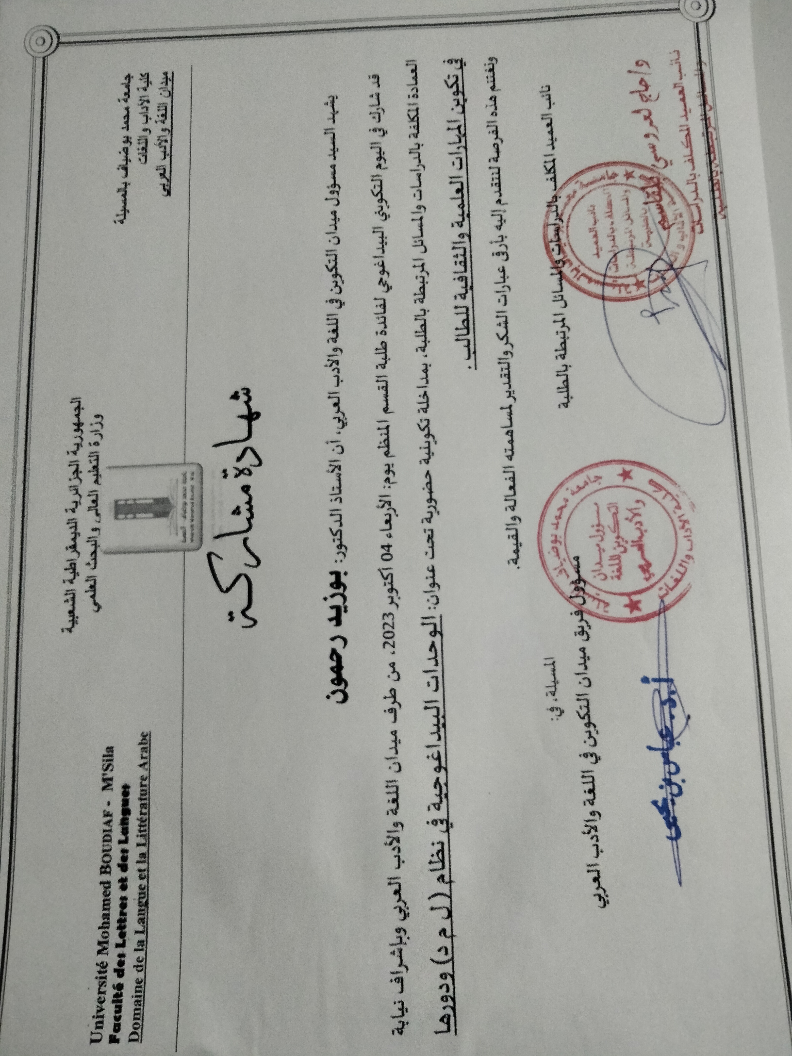 M. RAHMOUNE Bouzid, (2024-11-22), "يوم دراسي بيداغوجي", [national] التنسيق الإداري للطالب على مستوى هيئات القسم , كلية الآداب واللغات