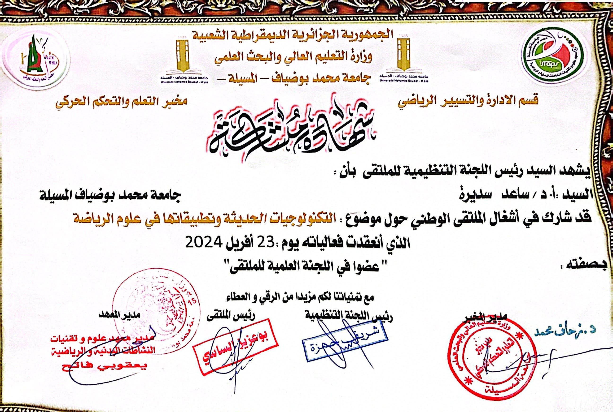 M. SEDIRA Saad, (2023-12-23), "تطبيق العملية التقويمية داخل النوادي الرياضية الخاصة بالكرة الطائرة", [national] الملتقى الوطني السادس تيسمسيلت , جامعة تيسمسيلت