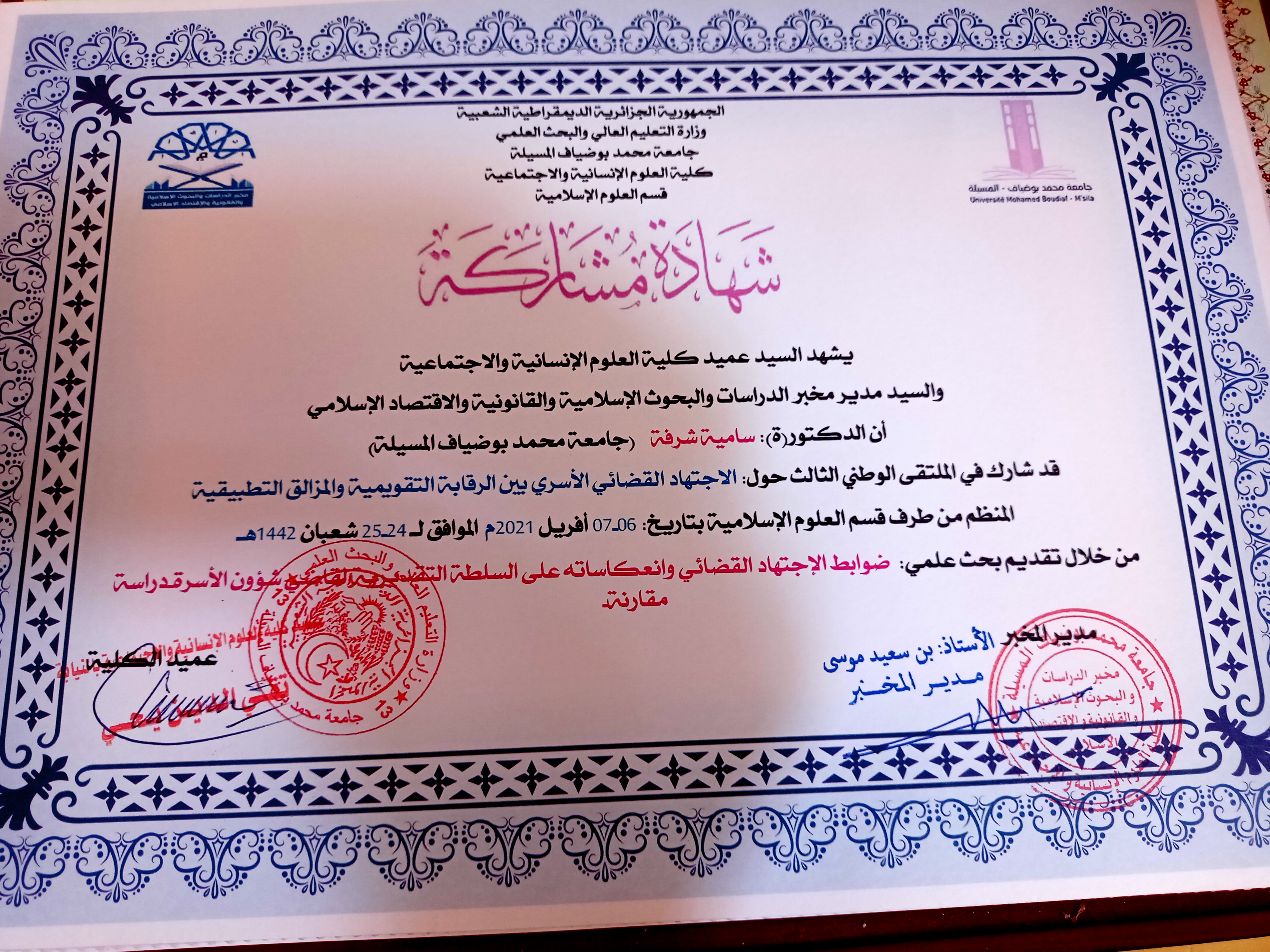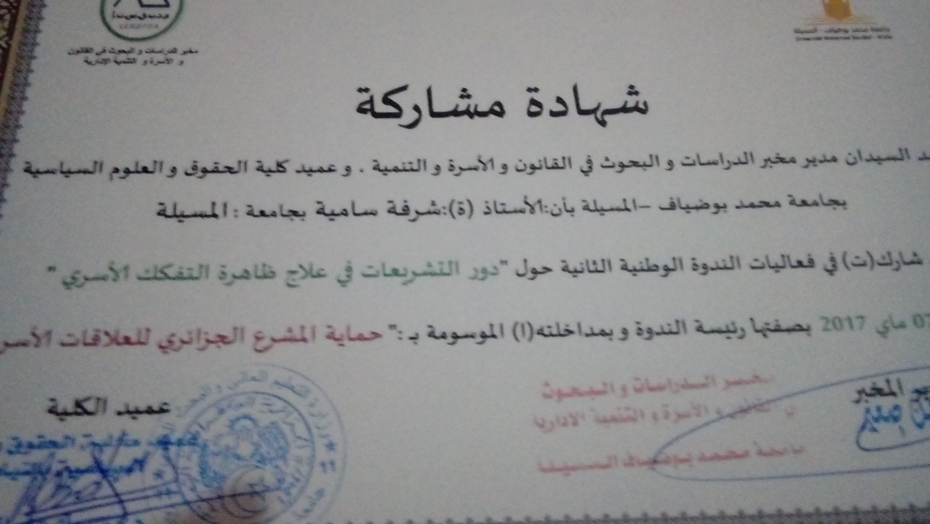 M. SAMIA Cheurfa, (2019), "أشغال الندوة الوطنية الثانيبة"دور التشريعات في علاج ظاهرة التفكك الأسري"", [national] , محبر الدراسات والبحوث في القانون والأسرة والتنمية الادارية كلية الحقوق جامعة مسيلة