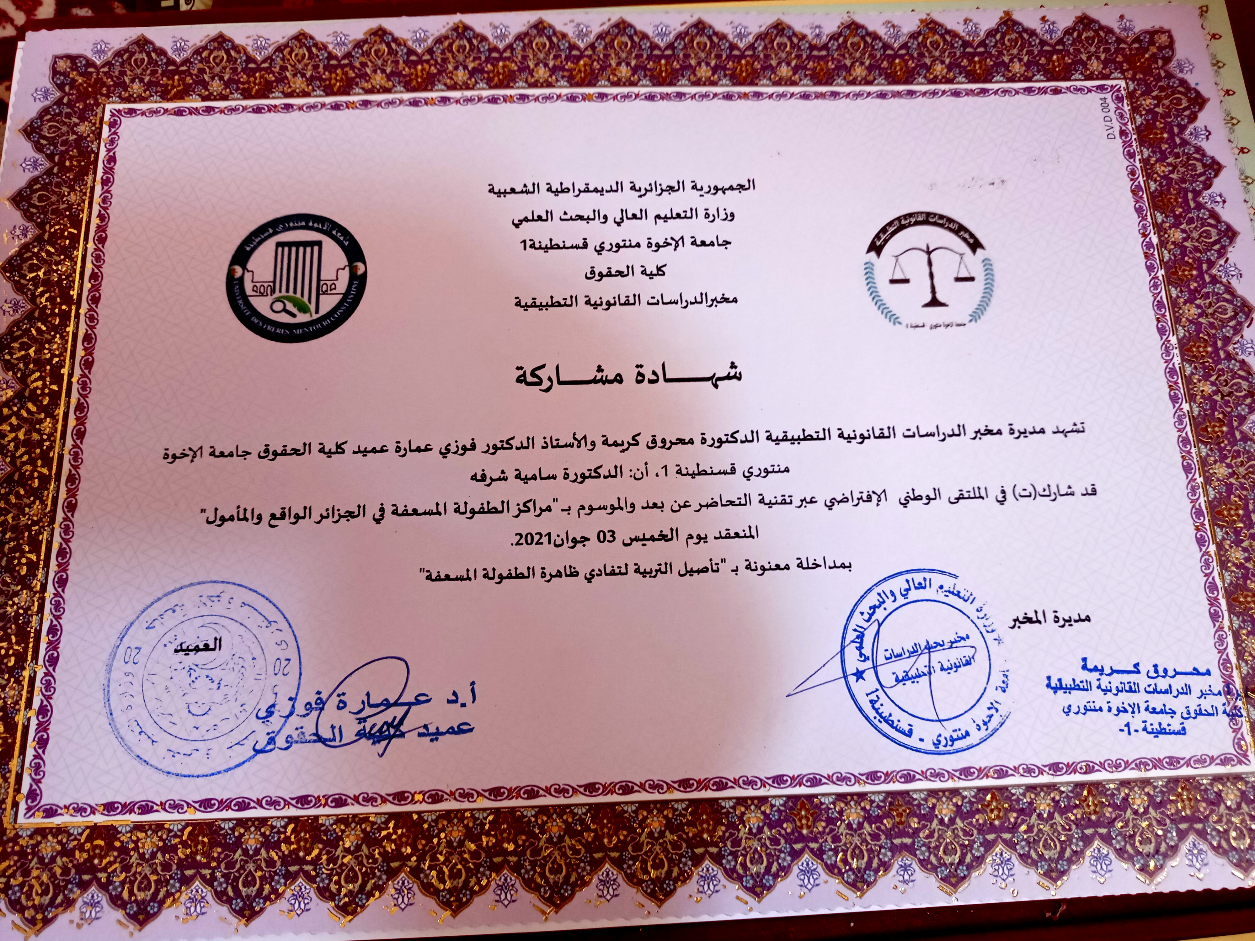 M. SAMIA Cheurfa, (2021), "تأصيل التربية لتفادي الطفولةالمسعفة", [national] مراكز الطفولة المسعفة في الجزائر الواقع والمأمول , جامعة الاخوة منتوري قسنطينة كلية الحقوق
