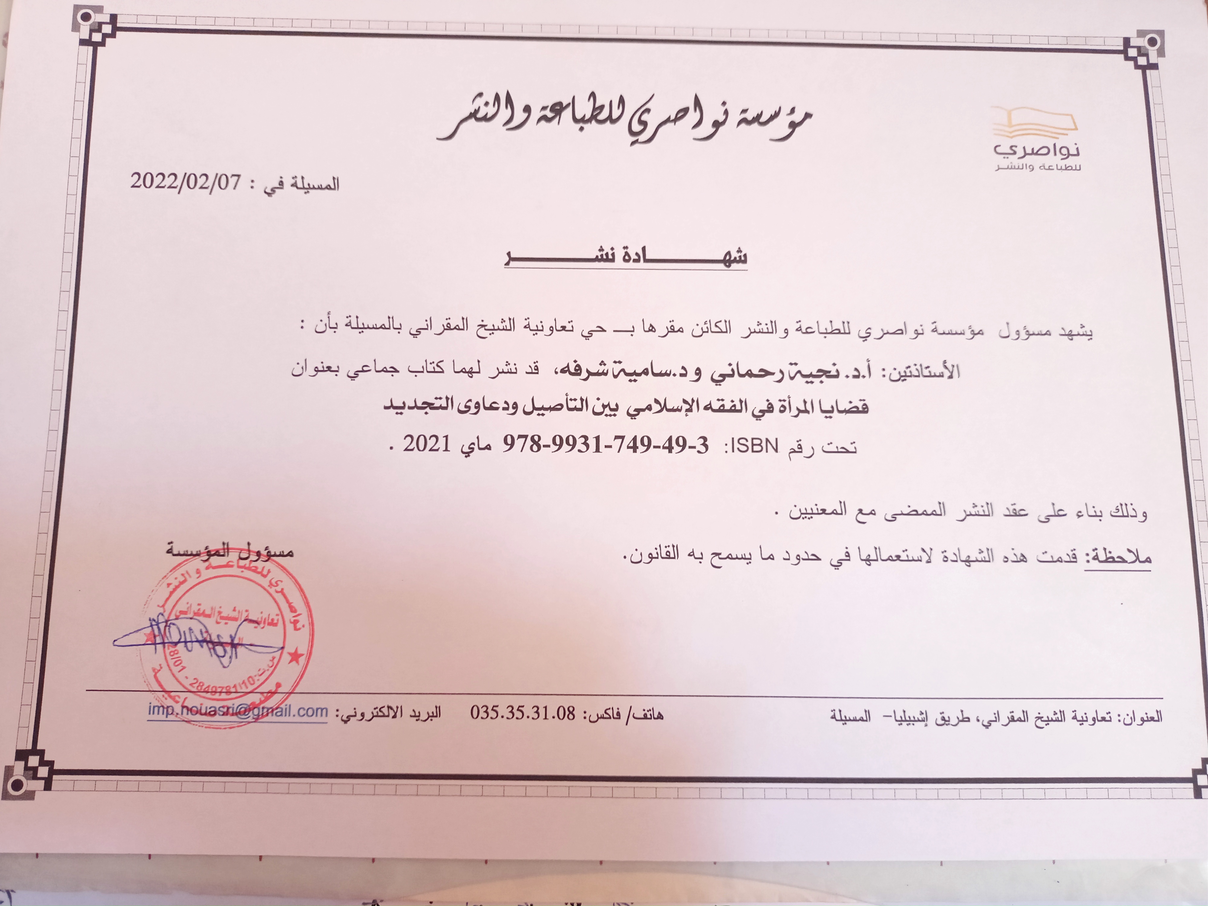 M. SAMIA Cheurfa, (2020), "قضايا المراة في الفقه الاسلامي بين التأصيل ودعادى التجديد", [national] , مؤسسة نواصري للطباعة والنشر