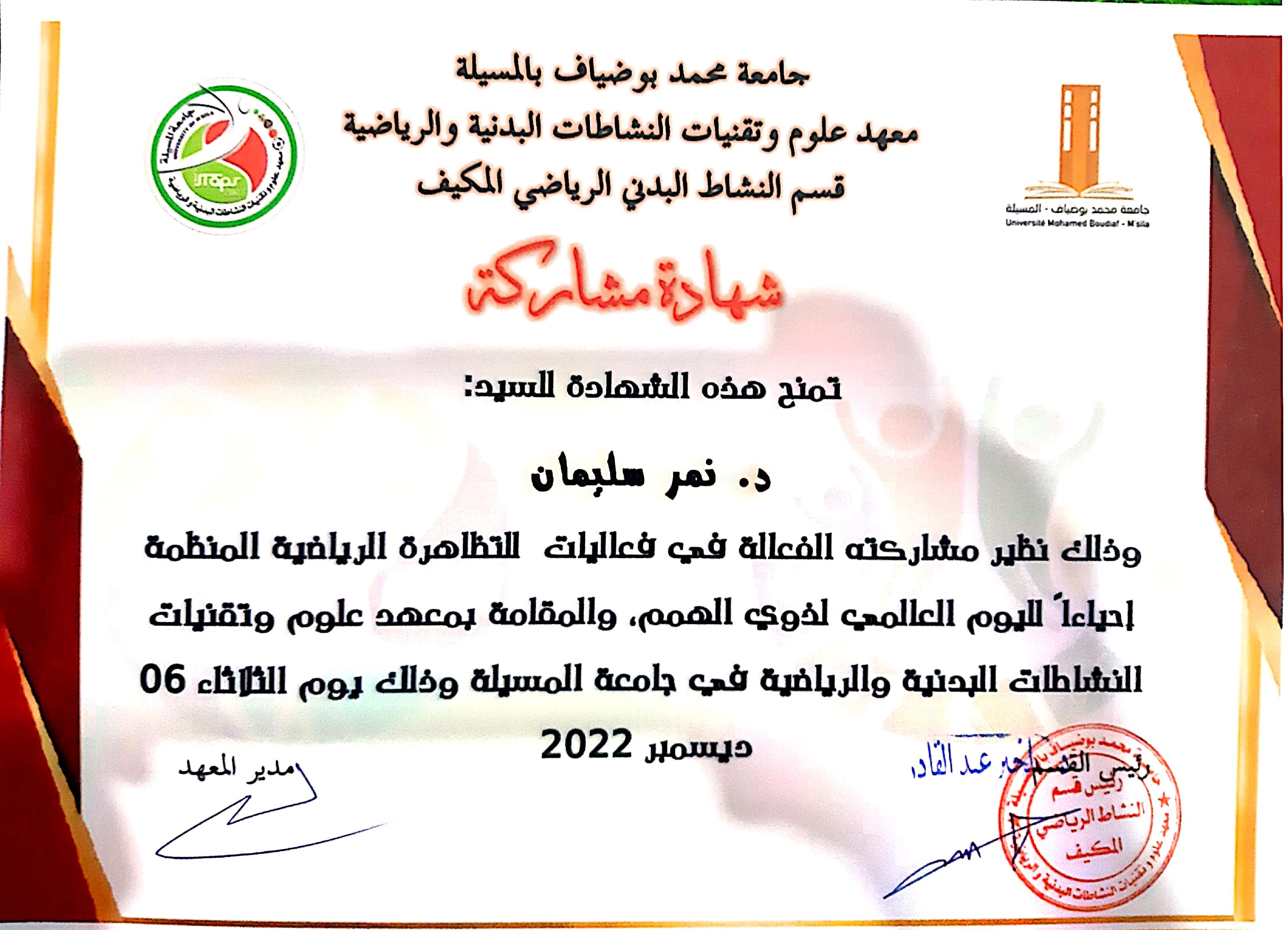 M. NEMER Slimane, (2022), "فعاليات التظاهرة الرياضية المنظمة إحياء لليوم العالمي لذوي الهمم", [national] فعاليات التظاهرة الرياضية المنظمة إحياء لليوم العالمي لذوي الهمم , جامعة محمد بوضياف المسيلة