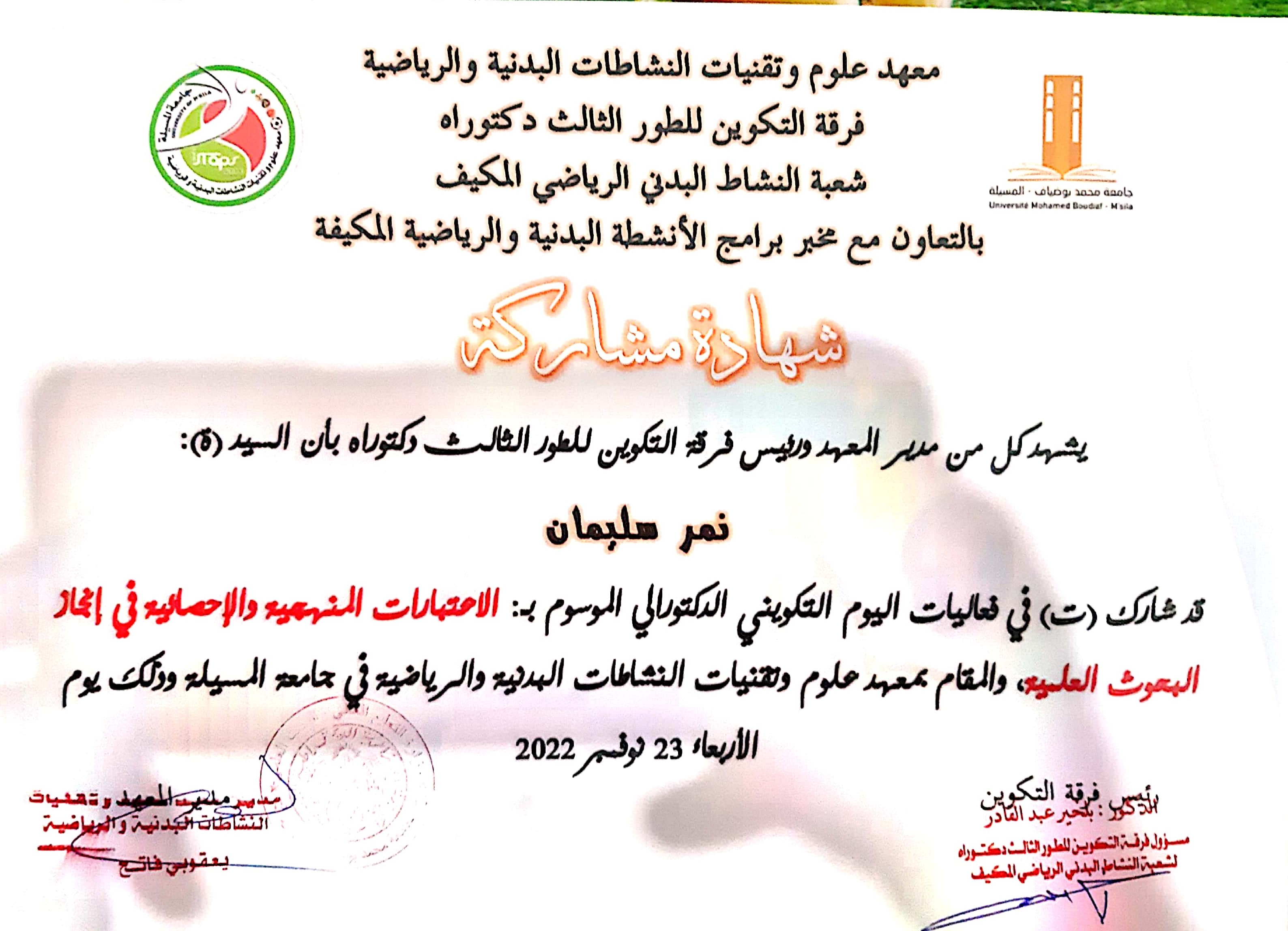 M. NEMER Slimane, (2022), "اليوم التكويني الدكتورالي الموسوم بالاعتبارات المنهجيةو الاحصائية في انجاز البحوث العلمية", [national] اليوم التكويني الدكتورالي الموسوم بالاعتبارات المنهجيةو الاحصائية في انجاز البحوث العلمية , جامعة محمد بوضياف المسيلة
