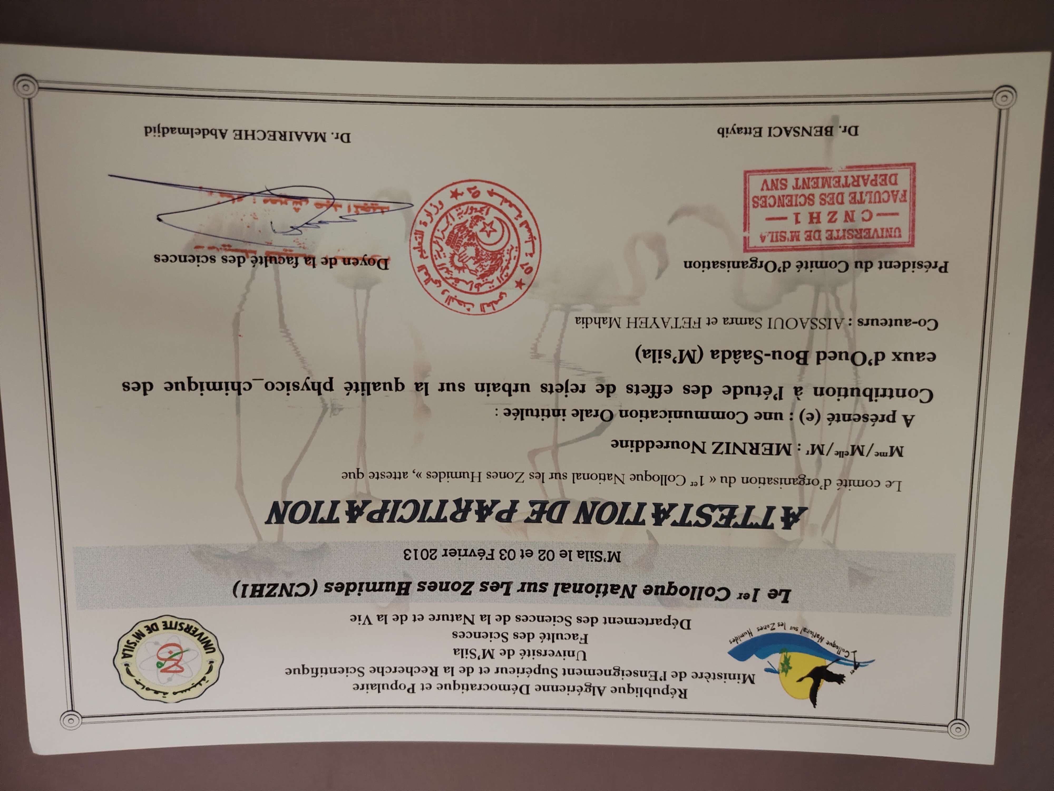 M. MERNIZ Noureddine, (2013-02-02), "Le 1er Colloque National sur Les Zones Humides (CNZH1)", [national] Contribution à l’étude des effets de rejets urbain sur la qualité physico_chimique des eaux d’Oued Bou-Saâda , UNIVERSITE DE M’SILA Faculté des Sciences Département des Sciences de la Nature et de la Vie