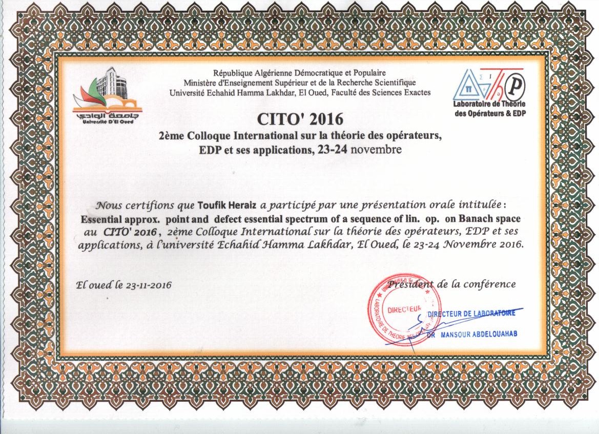 M. HERAIZ Toufik, (2016), "ESSENTIAL APPROXIMATE POINT, AND ESSENTIAL DEFECT SPECTRUM OF A SEQUENCE OF LINEAR OPERATORS IN BANACH SPACES", [international] CITO 2016 , Elchahid Hamma Lahdar Univerity- Eloued Algeria