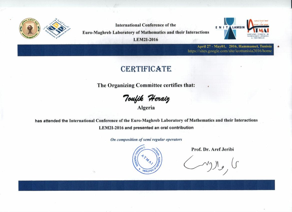 M. HERAIZ Toufik, (2016), "On Composition of semi-regular operattors", [international] International Conference of The Euro-Mahreb Laborattory Of Mathematics And their Interaction , sFax Tunisia