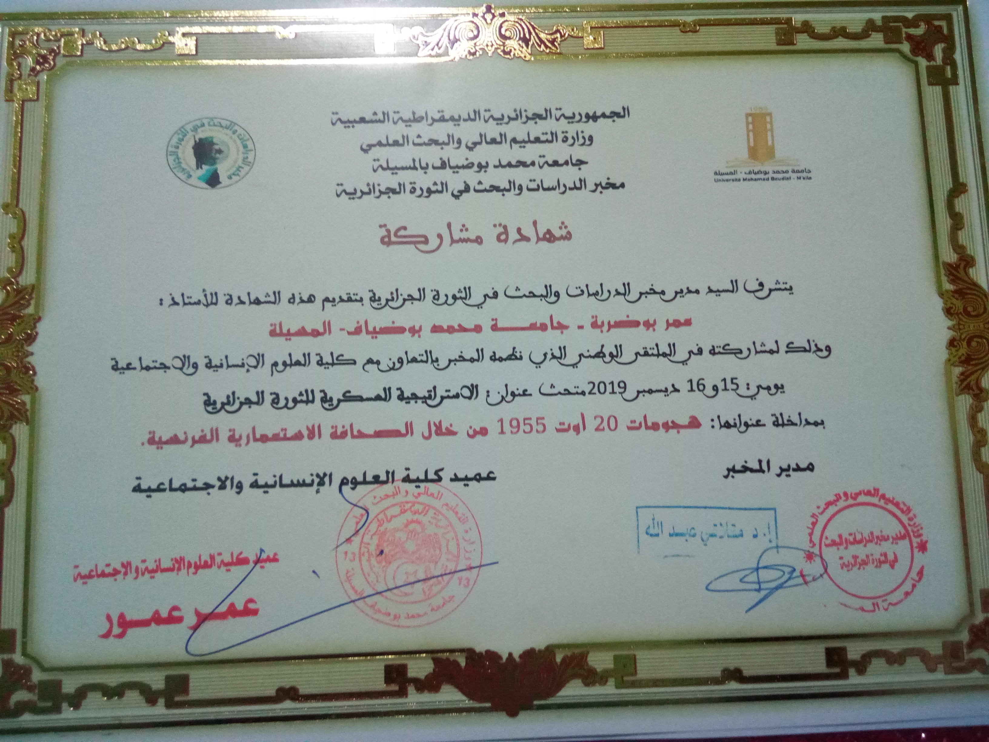 M. BOUDERBA. Omar, (2018), "هجومات 20 أوت 1955 بالشمال القسنطيني من خلال جريدة L’Echo d’Alger", [national] , منشورات مخبر الدراسات والبحث في الثورة الجزائرية، جامعة محمد بوضياف بالمسيلة،2018