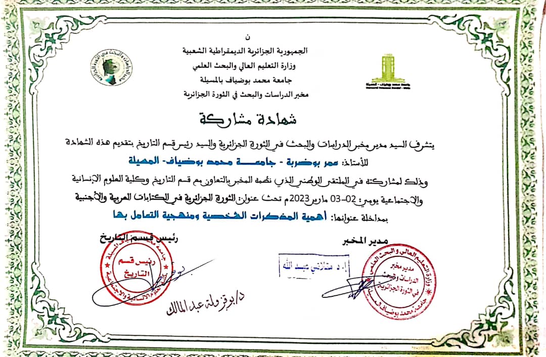 M. BOUDERBA. Omar, (2023), "الثورة الجزائرية في الكتابات العربية والأجنبية", [national] أهمية المذكرات الشخصية ومنهجية التعامل معها , جامعة محمد بوضياف المسيلة