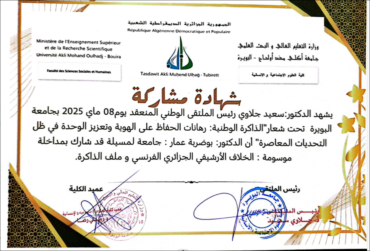 M. BOUDERBA. Omar, (2025-05-08), "الذاكرة الوطنية", [national] الخلاف الأرشيفي الجزائري الفرنسي وملف الذاكرة , جامعة محند آكلي ولحاج -البويرة
