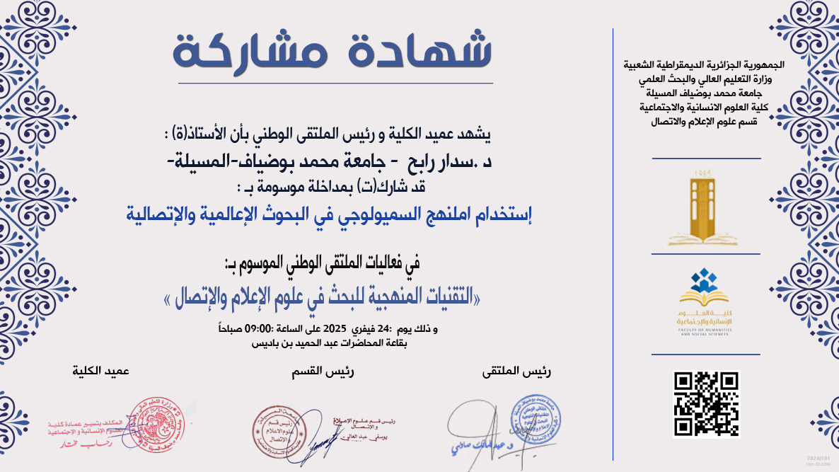 M. SEDDAR Rabah, (2025-02-24), "استخدام المنهج السميولوجي في البحوث الاعلامية و الاتصالية", [national] التقنيات المنهجية للبحث في علوم الاعلام و الاتصال , كلية العلوم الانسانية و الاجتماعية، جامعة المسيلة