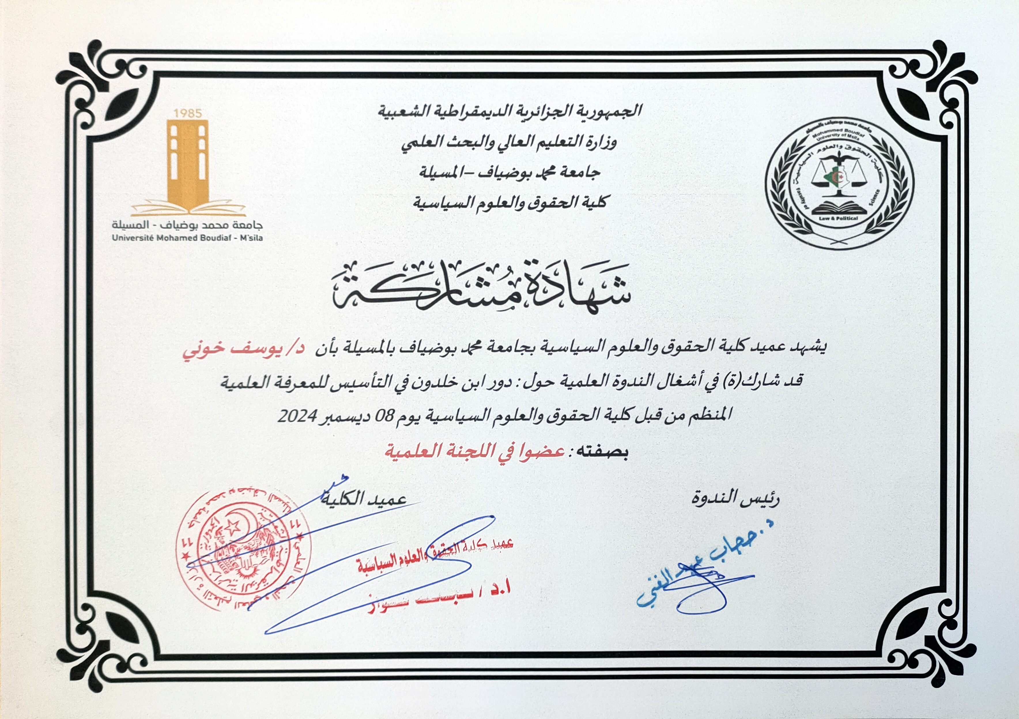M. KHOAUNI Youcef, (2024-12-08), "عضو اللجنة التنظيمية", [national] دور ابن خلدون في التاسيس للمعرفة العلمية