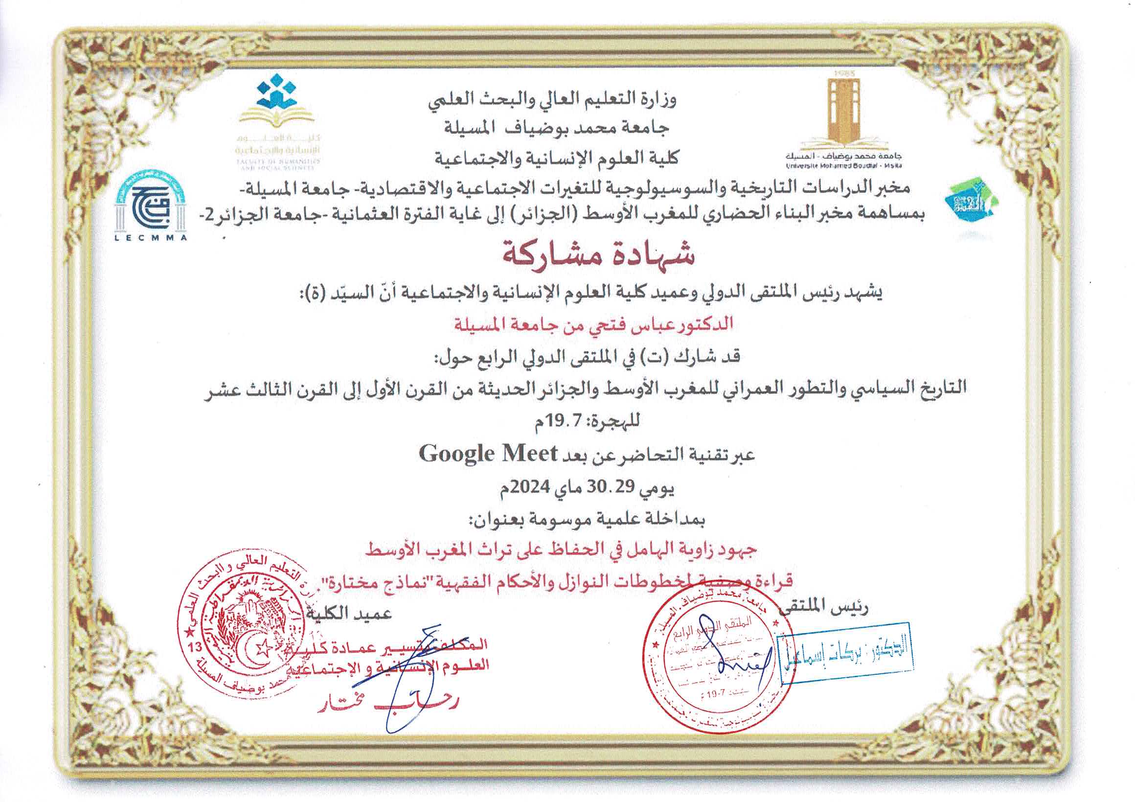 M. FATHI Abbes, (2024-05-29), "جهود زاوية الهامل في الحفاظ على تراث المغرب الأوسط قراءة وصفية لمخطوطات النوازل الفقهية ـ نماذج مختارة", [international] فتحي عباس , كلية العلوم الانسانية والاجتماعية جامعة محمد بوضياف بالمسيلة
