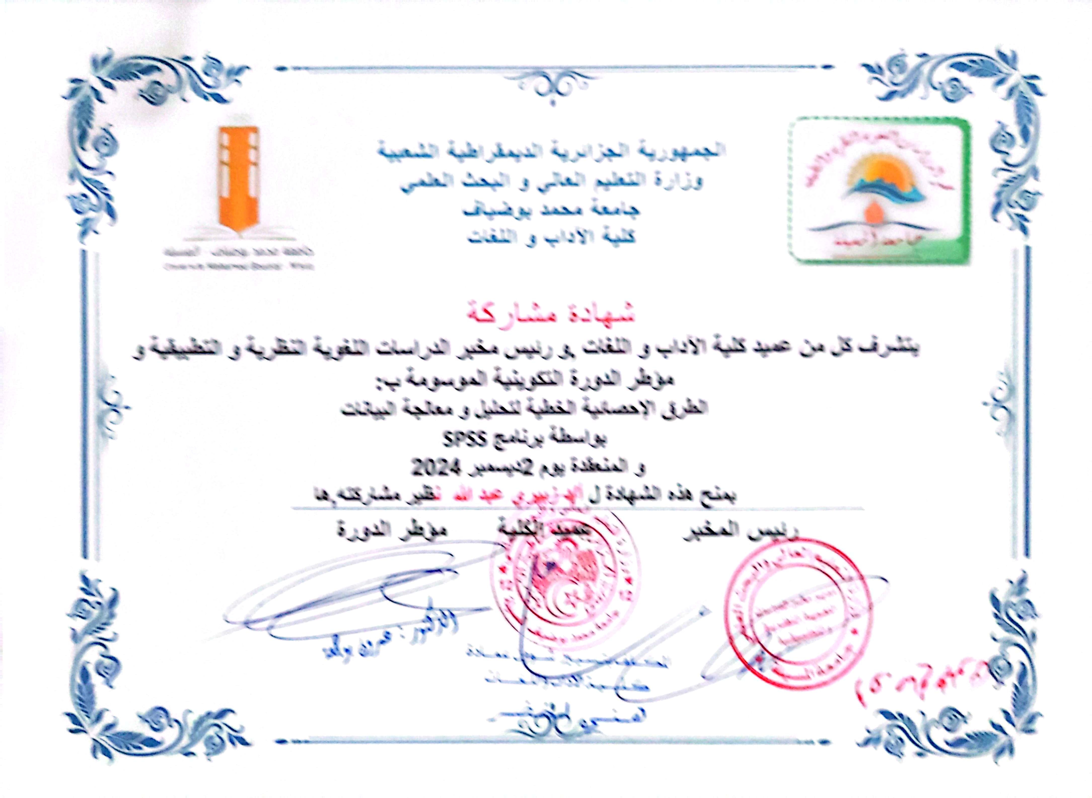 M. ABDALLAH Zoubiri, (2024-12-02), "الطرق الاحصائية الخطية لتحليل ومعالجة البيانات بواسطة برنامج SPSS", [national] الطرق الاحصائية الخطية لتحليل ومعالجة البيانات بواسطة برنامج SPSS , جامعة المسيلة