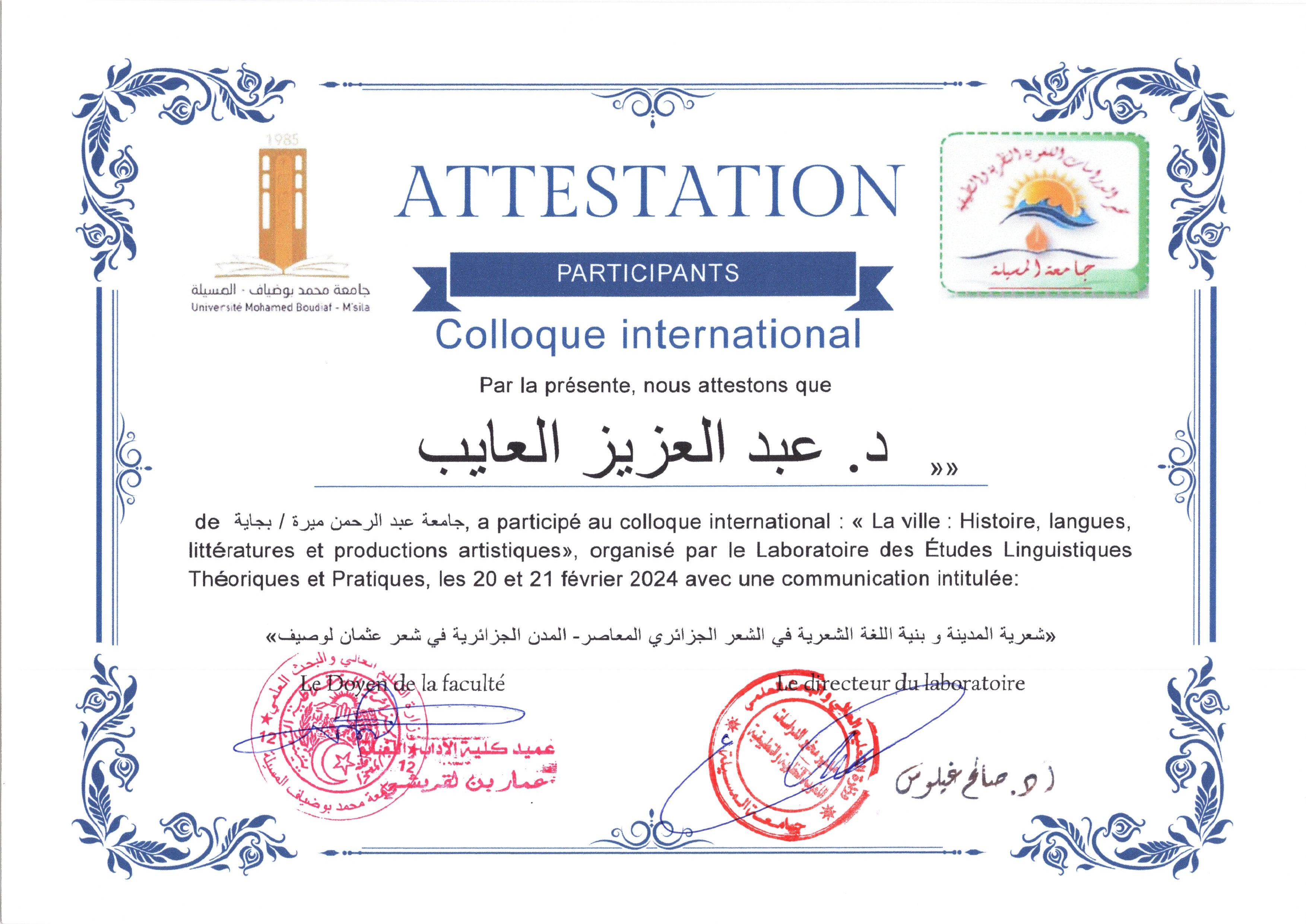 M. LAIEB Abdelaziz, (2024-02-20), "شعرية المدينة،وبنية اللغة الشعرية؛-المدن الجزائرية في شعر عثمان لوصيف", [international] La ville;histoire,longues,littératures et production artistiques , جامعة المسيلة