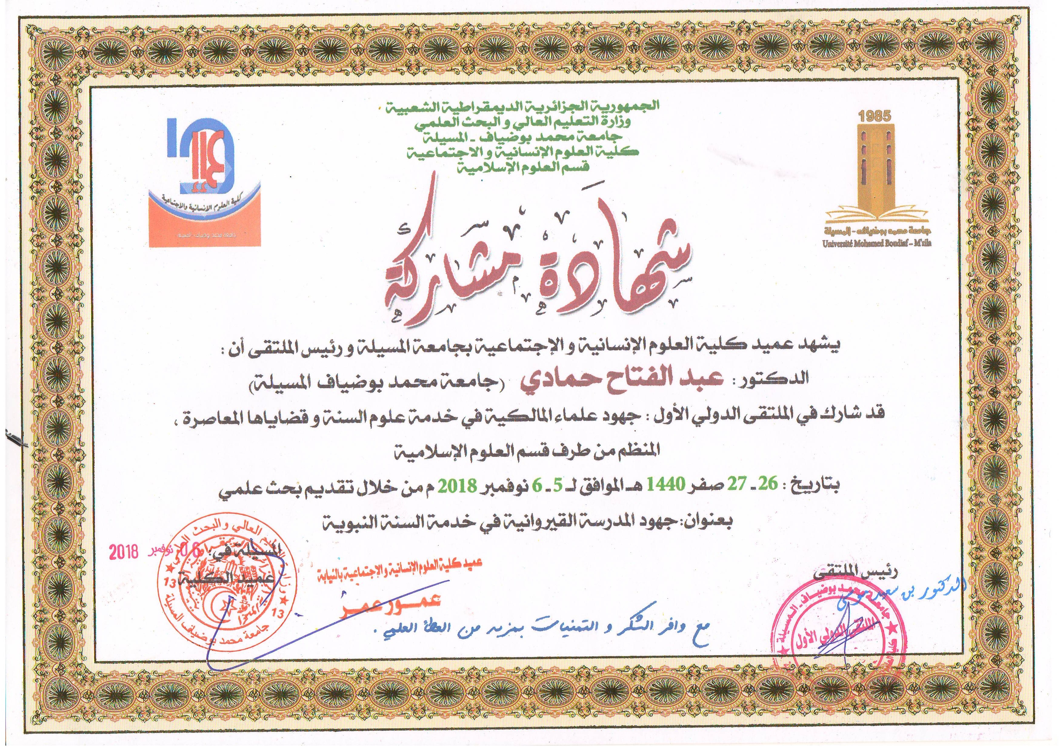 M. HAMADI Abdelfateh, (2017), "جهود المدرسة القيروانية في خدمة السنة النبوية", [international] جهود علماء المالكية في خدمة علوم السنة وقضاياها المعاصرة , جامعة المسيلة
