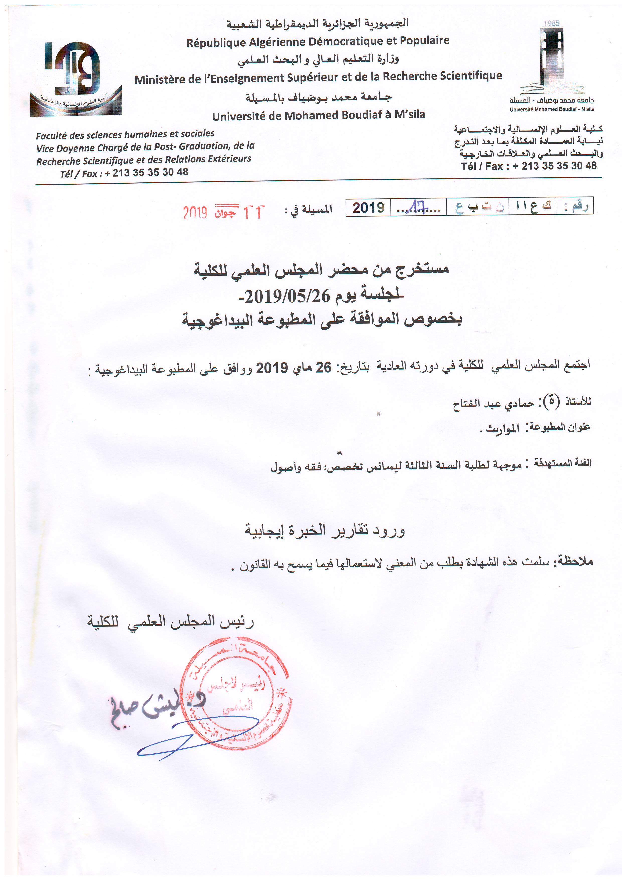 M. HAMADI Abdelfateh, (2019), "مطبوعة في مقياس المواريث", [national] جامعة المسيلة