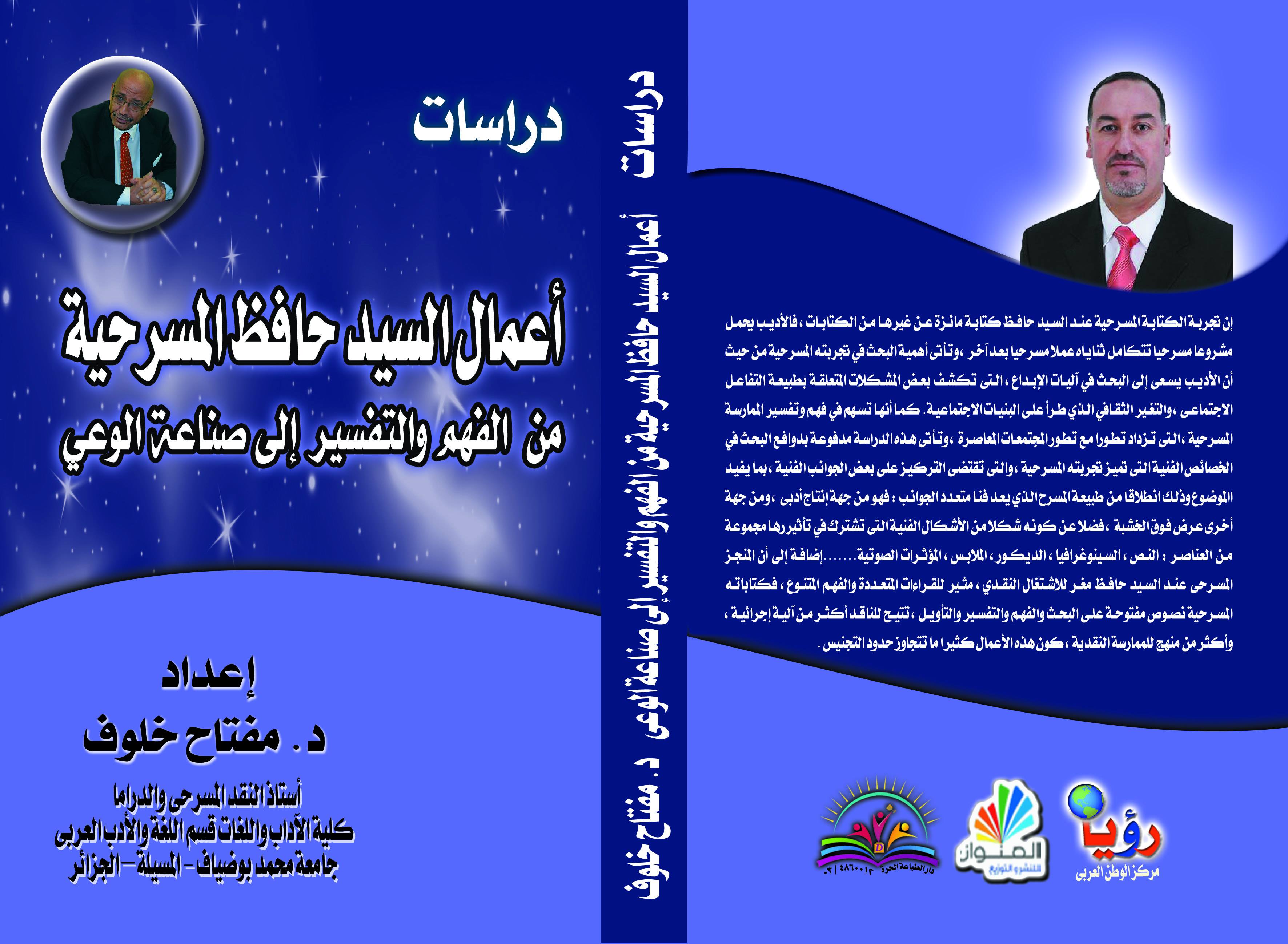 M. KHELOUF Meftah, (2020), "أعمال السيد حافظ المسرحية من الفهم والتفسير إلى صناعة الوعي", [national] , - مركز الوطن العربي"رؤيا" القاهرة مصر - "العنوان" للنشر والتوزيع الشارقة - دار الطباعة الحرة للطباعة والنشر