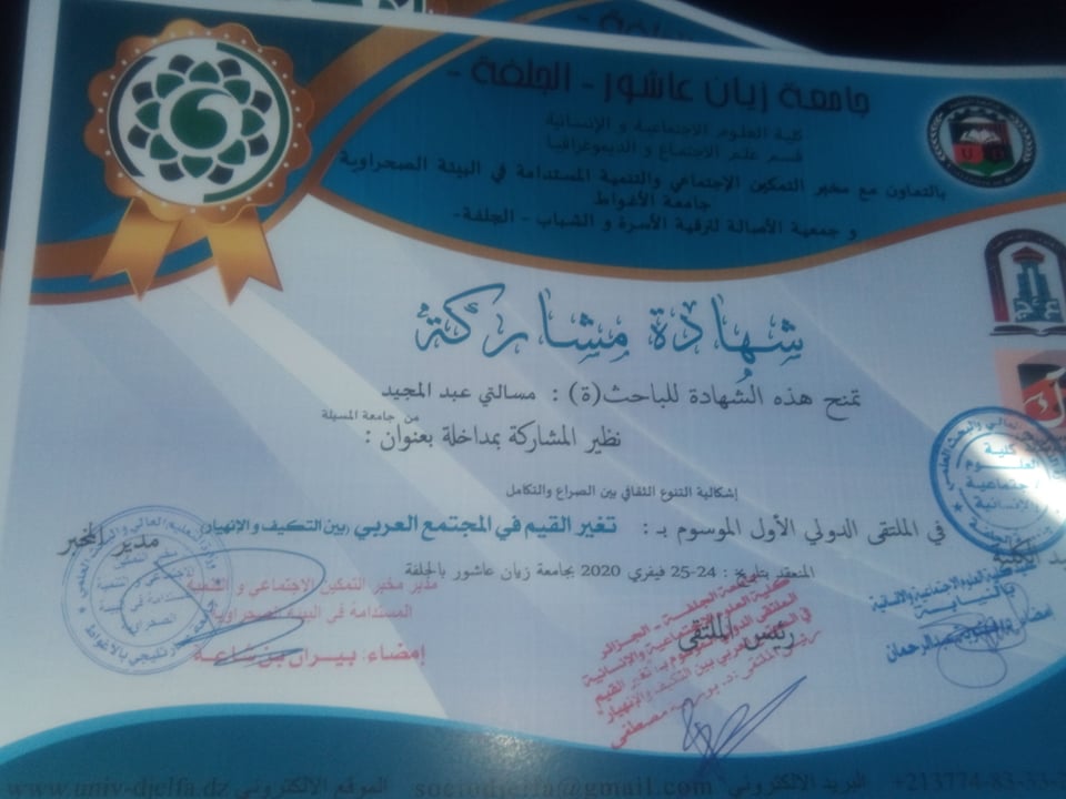 M. MESSALTI Abdelmadjid, (2020), "ملتقى دولي)إشكالية التنوع الثقافي بين الصراع والتكامل)", [international] تغيير القيم في المجتمع العربي بين التكيف والانهيار , جامعة زيان عاشور الجلفة