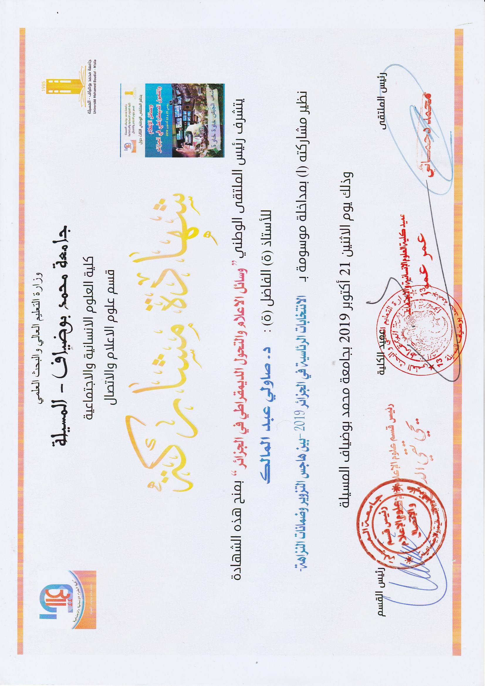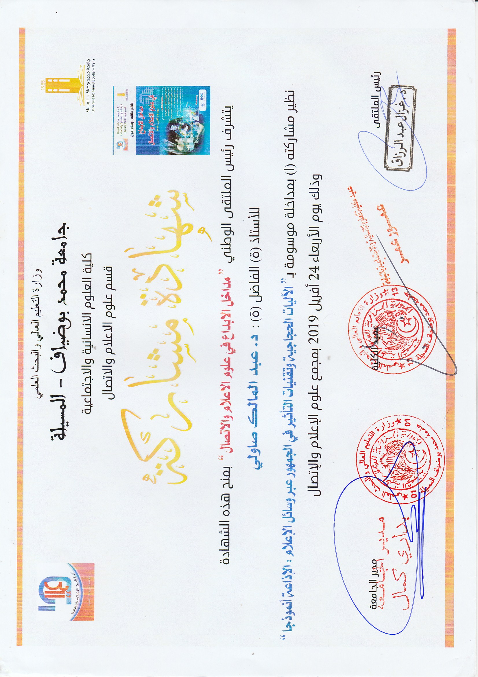 M. SAOULI صاولي Abdelmalik عبد المالك, (2022), "الفضائيات الجزائرية الخاصة بين الواقع المهني والمسؤولية الاجتماعية", [national] ملتقى وطني حول الفضائيات الجزائرية الخاصة , جامعة المسيلة
