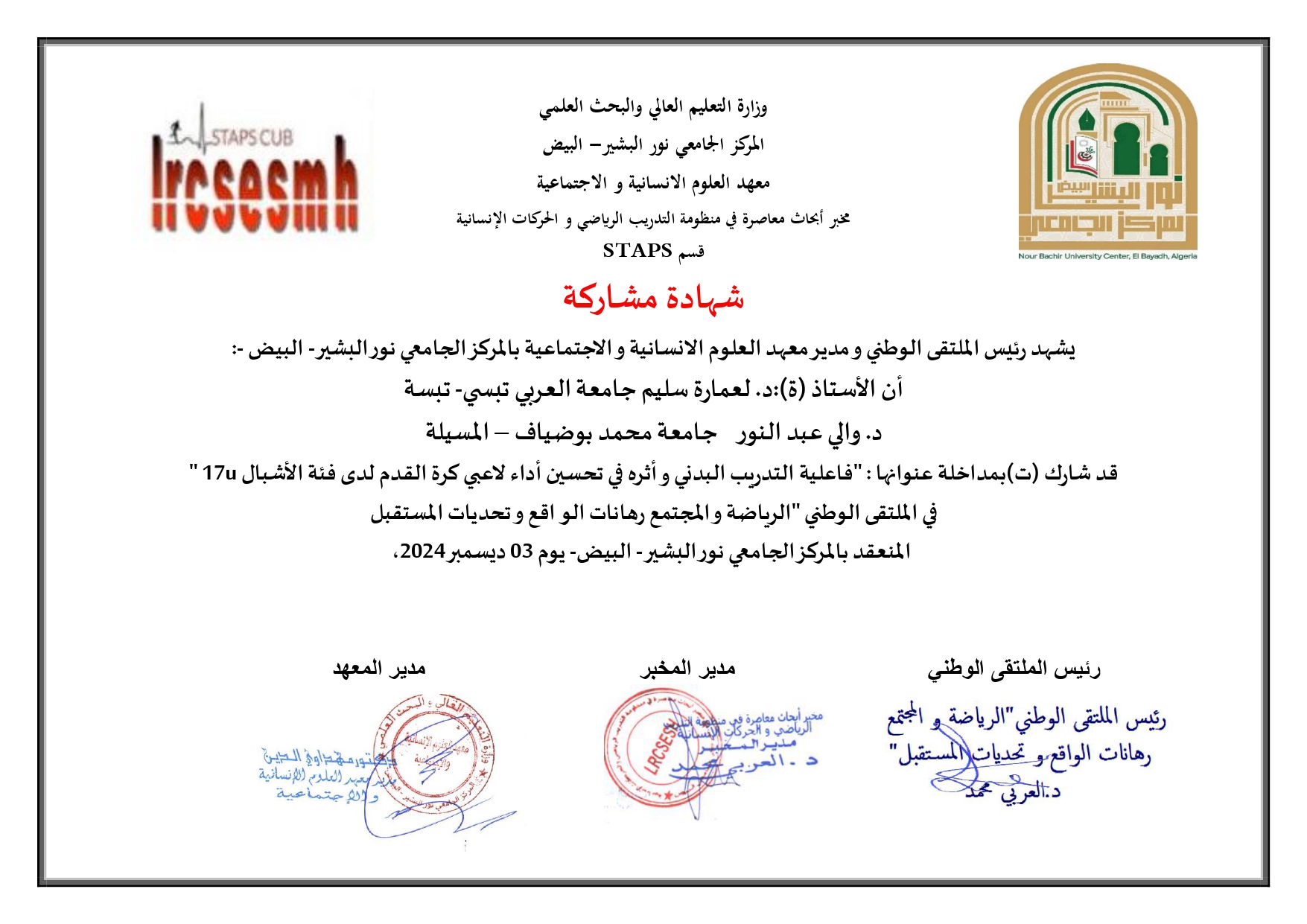 M. OUALI Abdennour, (2024-12-03), "فاعلية التدريب البدني وأثره في تحسين أداء لاعبي كرة القدم لدى فئة الأشبال", [national] الرياضة والمجتمع رهانات الواقع وتحديات المستقبل , المركز الجامعي نور البشير - البيض