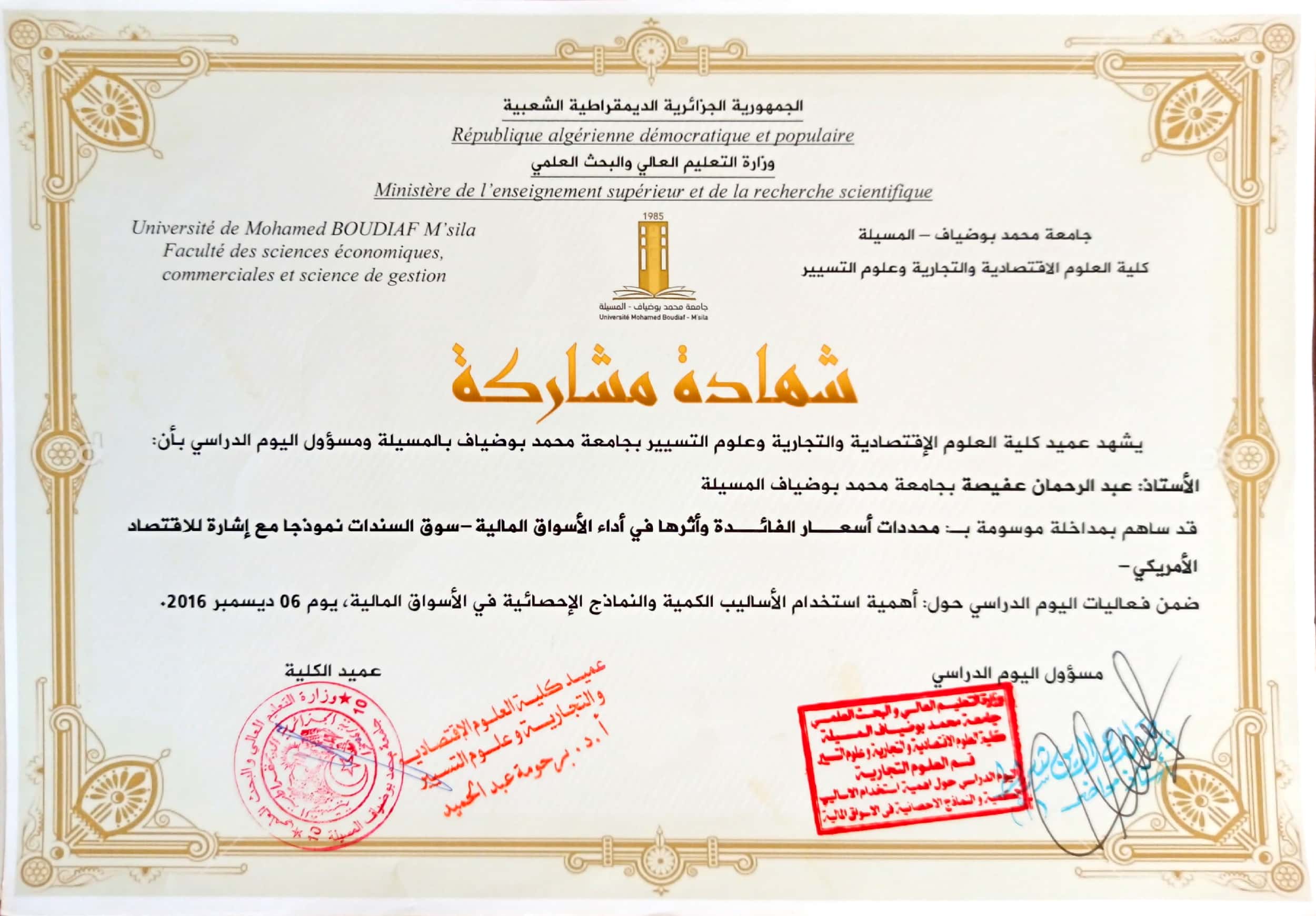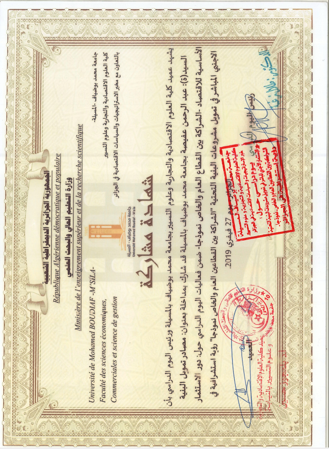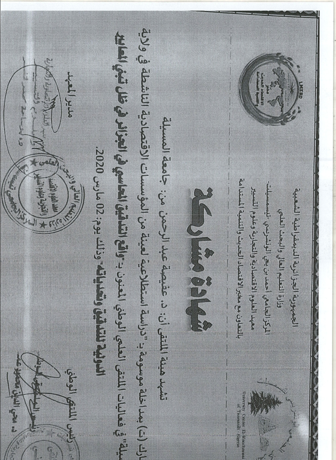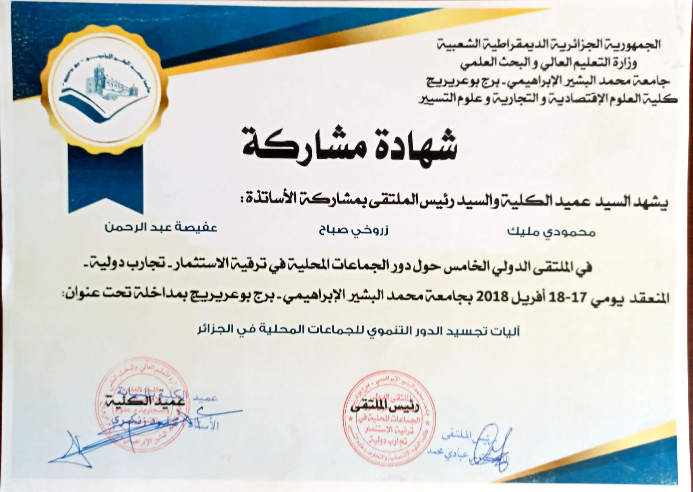 M. AFEISSA Abderrahmane, (2018), "آليات تجسيد الدور التنموي للجماعات المحلية في الجزائر", [international] الملتقى الدولي الخامس حول دور الجماعات المحلية في ترقية الإستثمار- تجارب دولية , جامعة محمد البشير الابراهيمي- برج بوعريريج