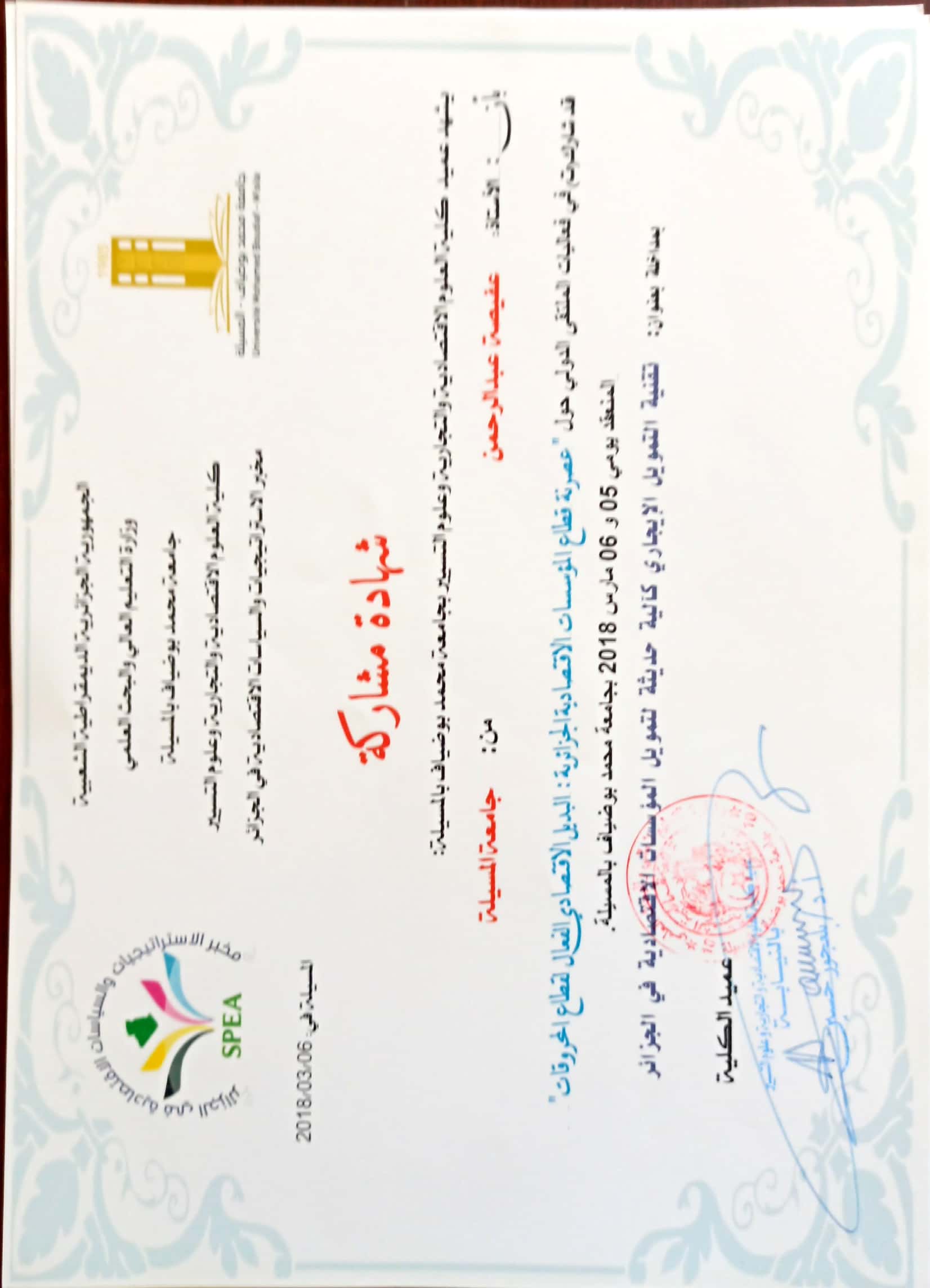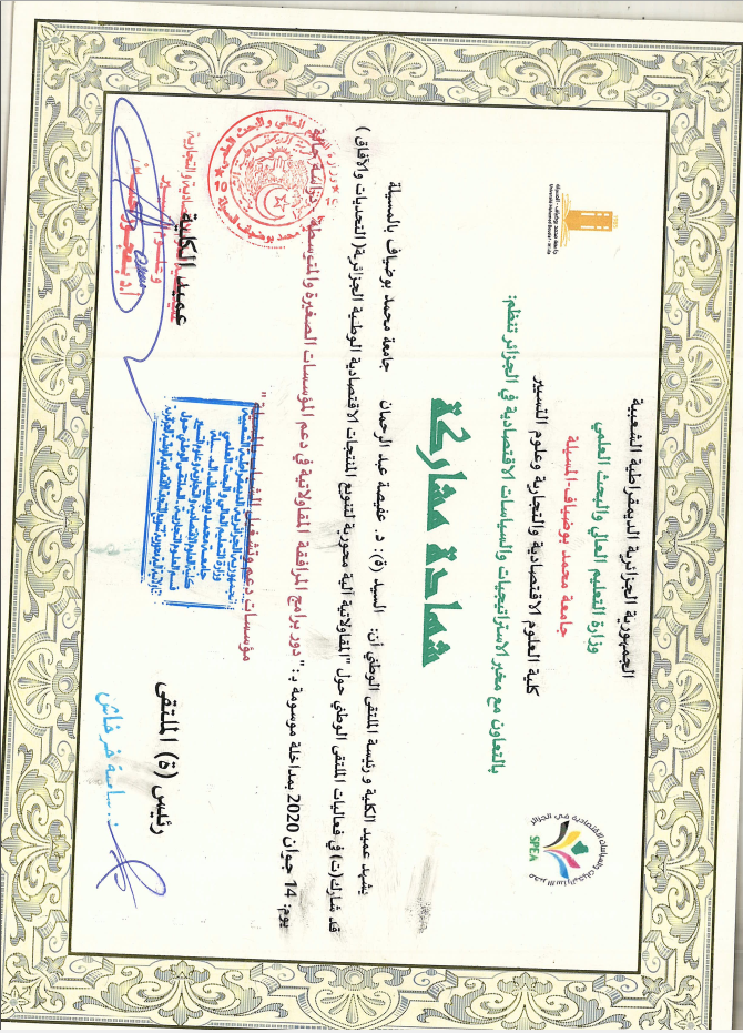 M. AFEISSA Abderrahmane, (2020-12-06), "دور برامج المرافقة المقاولاتية في دعم المؤسسات الصغيرة والمتوسطة", [national] المقاولاتية آلية محورية لتنويع المنتجات الاقتصادية الوطنية الجزائرية (التحديات والآفاق) , جامعة المسيلة