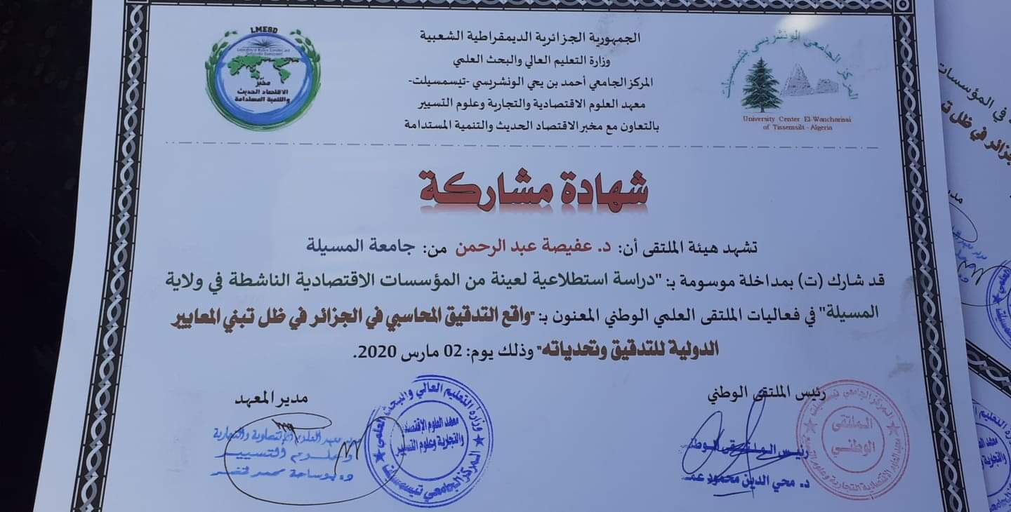 M. AFEISSA Abderrahmane, (2020-02-03), "دور التدقيق الداخلي في إرساء مباديء الحوكمة في المؤسسات الاقتصادية دراسة استطلاعية لعينة من المؤسسات الاقتصادية الناشطة في ولاية المسيلة", [national] واقع التدقيق المحاسبي في الجزائر في ظل تبني المعايير الدولية للتدقيق وتحدياته , المركز الجامعي أحمد بن يحي الونشريسي- تسمسيلت