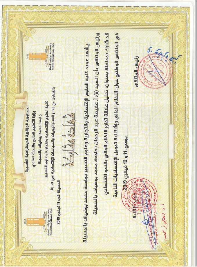 M. AFEISSA Abderrahmane, (2019-12-05), "تحليل علاقة تطور النظام المالي بالنمو الاقتصادي", [national] النظام المالي واشكالية تمويل الاقتصاديات النامية , جامعة المسيلة