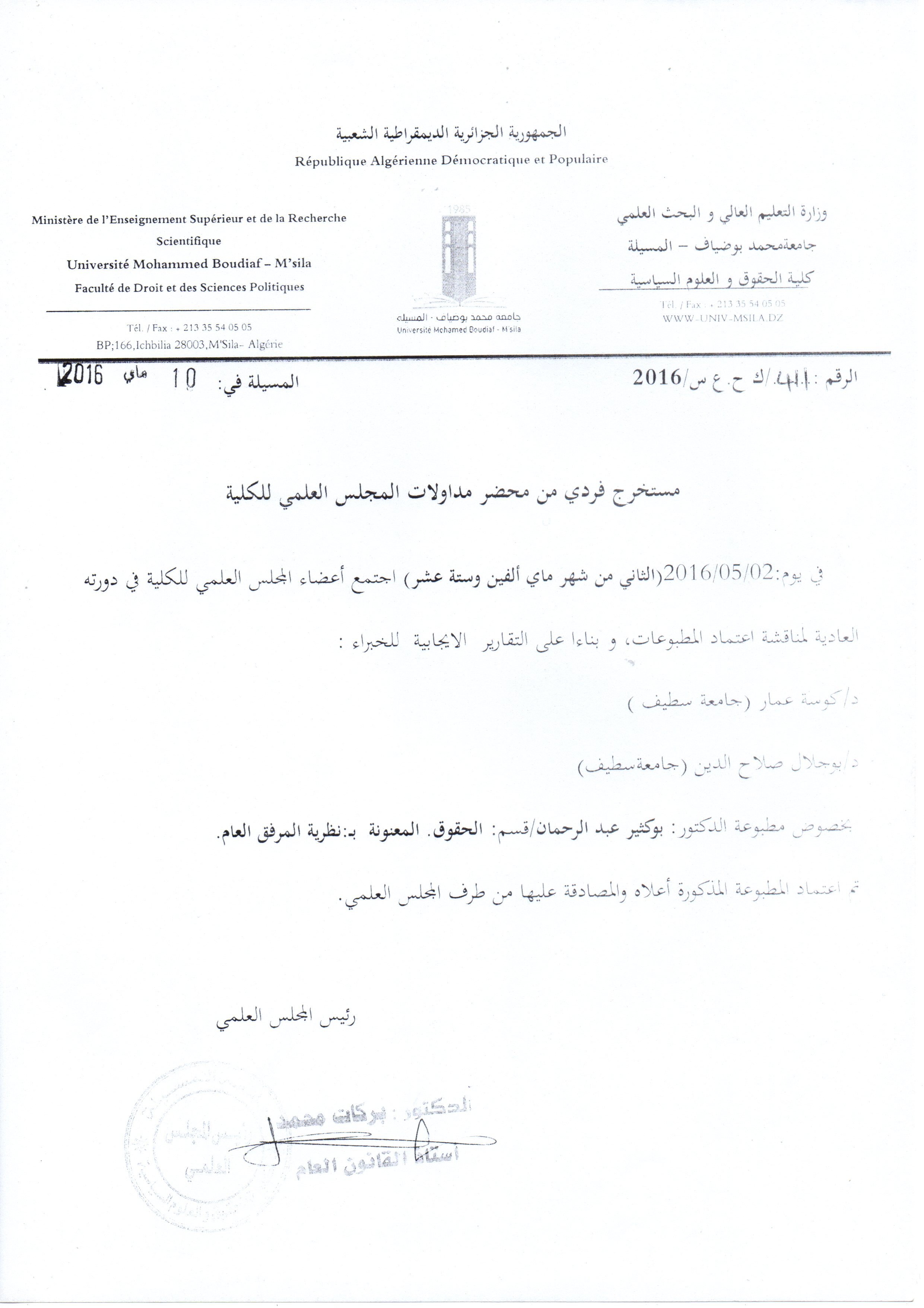 M. BOUKETIR Abderrahmane, (2016), "النظام القانوني للمرفق العام محاضرات ألقيت على طلبة ماستر 1، تخصص القانون الإداري", [national] جامعة مسيلة , جامعة مسيلة