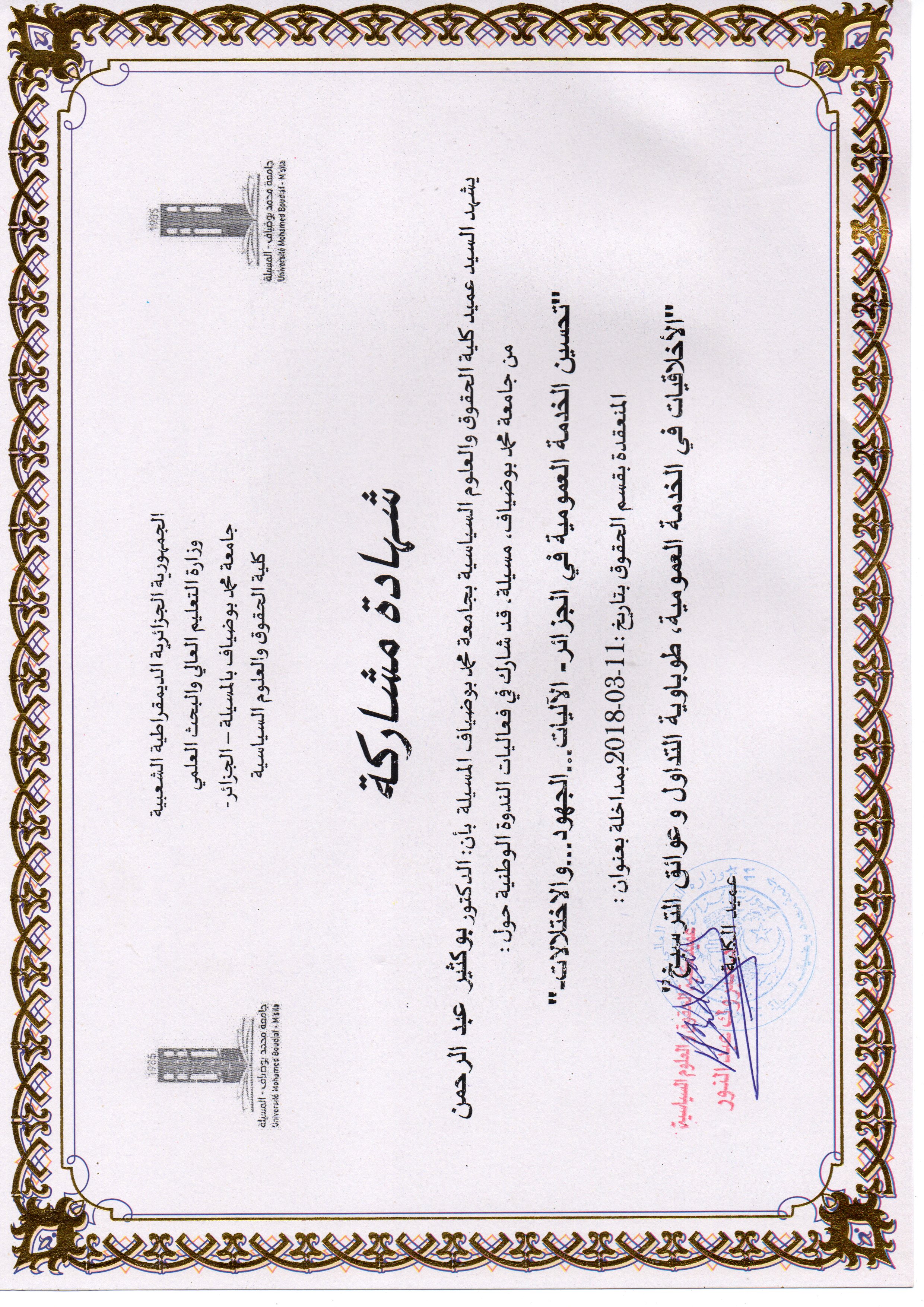 M. BOUKETIR Abderrahmane, (2018), "الأخلاقيات في الخدمة العمومية،طوباوية التداول وعوائق الترسيخ", [national] تحسين الخدمة العمومية في الجزائر، الآليات..الجهود...والاختلالات , كلية الحقوق والعلوم السياسية، جامعة مسيلة