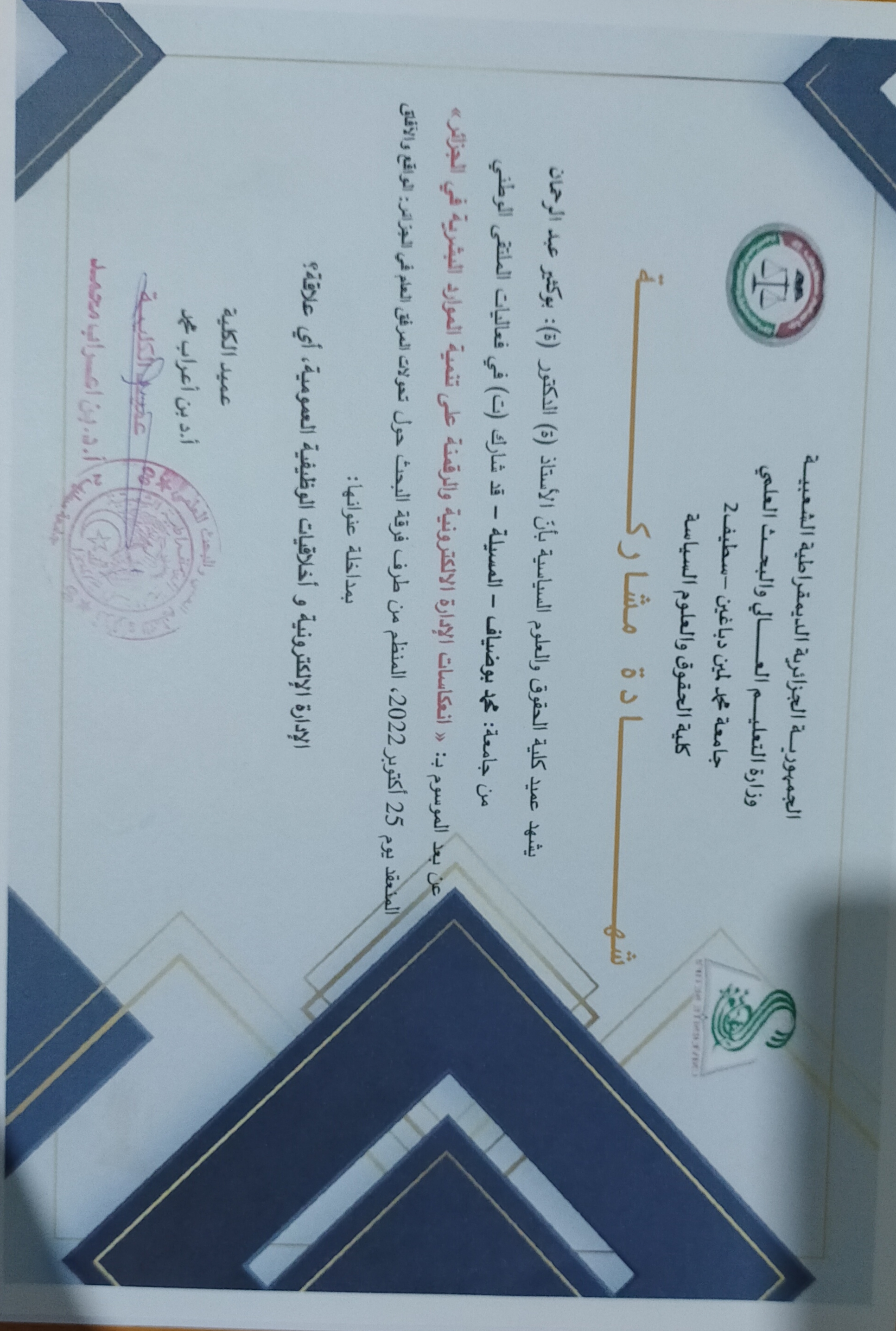 M. BOUKETIR Abderrahmane, (2022), "الادارة الالكترونية واخلاقيات الوظيفة العمومية، أي علاقة؟", [national] امعكاسات الادارة الالكترونية والرقمنة على تنمية الموارد البشرية في الجزائر , جامعة سطيف 2