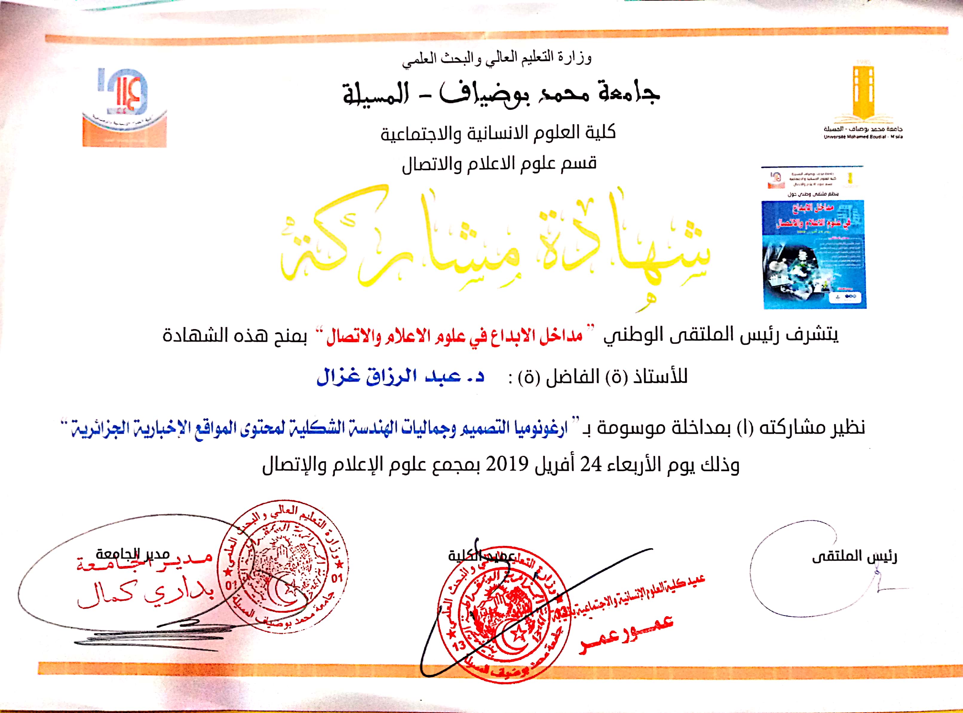 M. GHEZAL Abderrazzek, (2019), "ارغونوميا التصميم وجماليات الهندسة الشكلية لمواقع الصحف الالكترونية", [national] مداخل الابداع في علوم الاعلام والاتصال , جامعة المسيلة