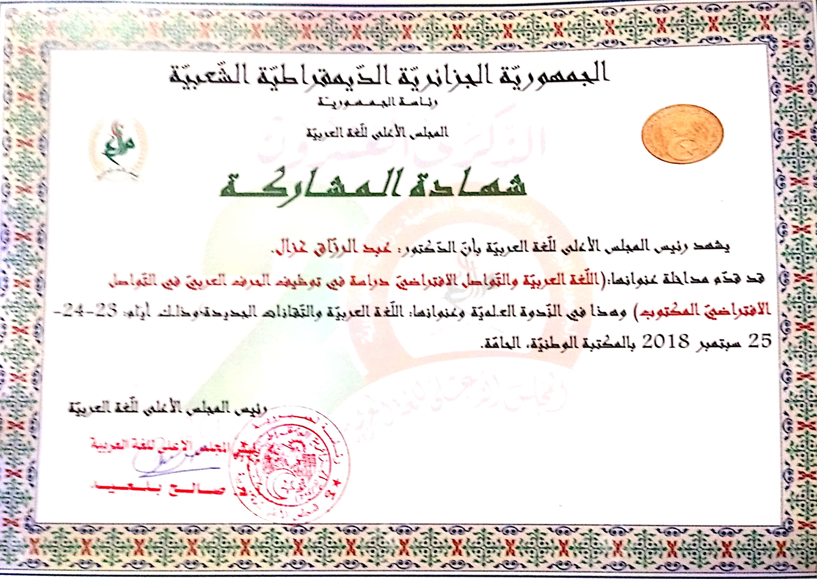 M. GHEZAL Abderrazzek, (2018), "اللغة العربية والتواصل الافتراضي", [national] اللغة العربية والتقانات الحديثة , المكتبة الوطنية- الجزائر - المجلس الاعلى للغة العربية
